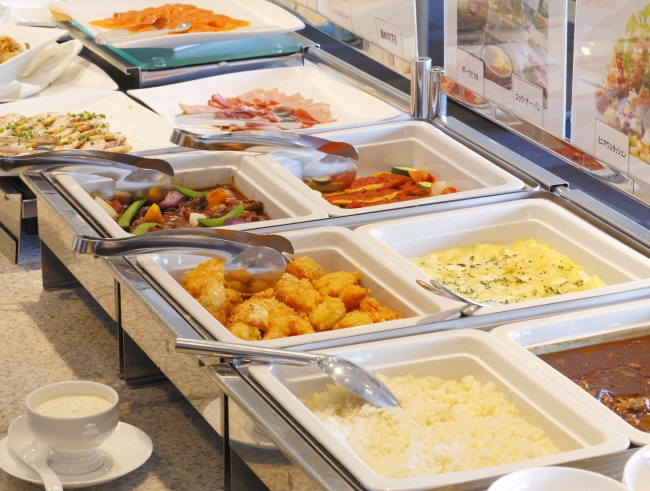 内容: ローストビーフやチーズ桶で仕上げるパスタ、デザートなど約30種類