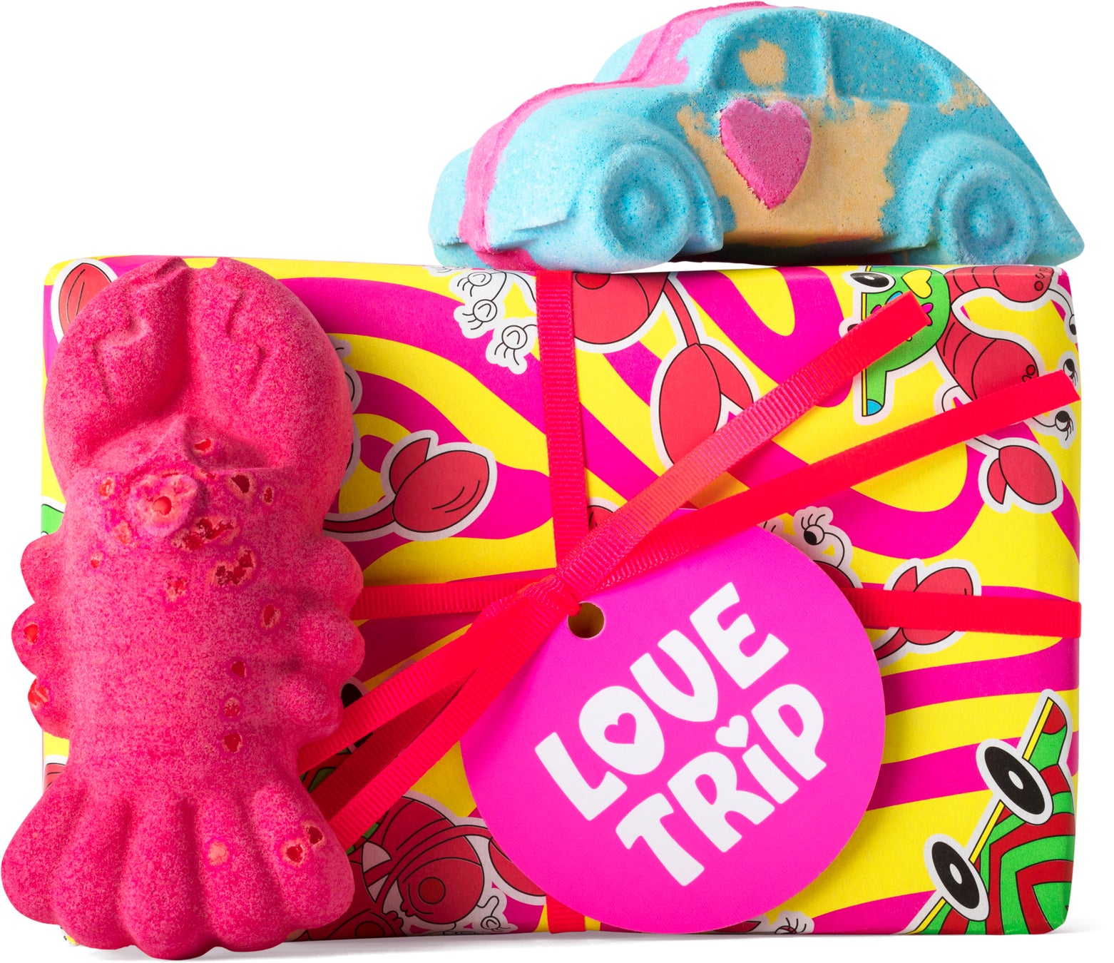 1970年代のサイケデリックな雰囲気漂うアニメーション風の包装紙を開けると、ユニークな形をしたバスボム2種類が入ったギフトです。この包装紙は、スペインのスタッフによるデザインで、中に入っているバスボムにちなんで描かれています。