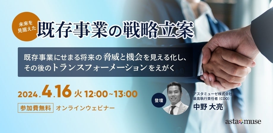 「既存事業の成長と変革」がテーマの無料ウェビナー「未来を見据えた既存事業の戦略立案 ~既存事業にせまる将来の<脅威と機会>を見える化し、その後の<トランスフォーメーション>をえがく~」を4月に再開催