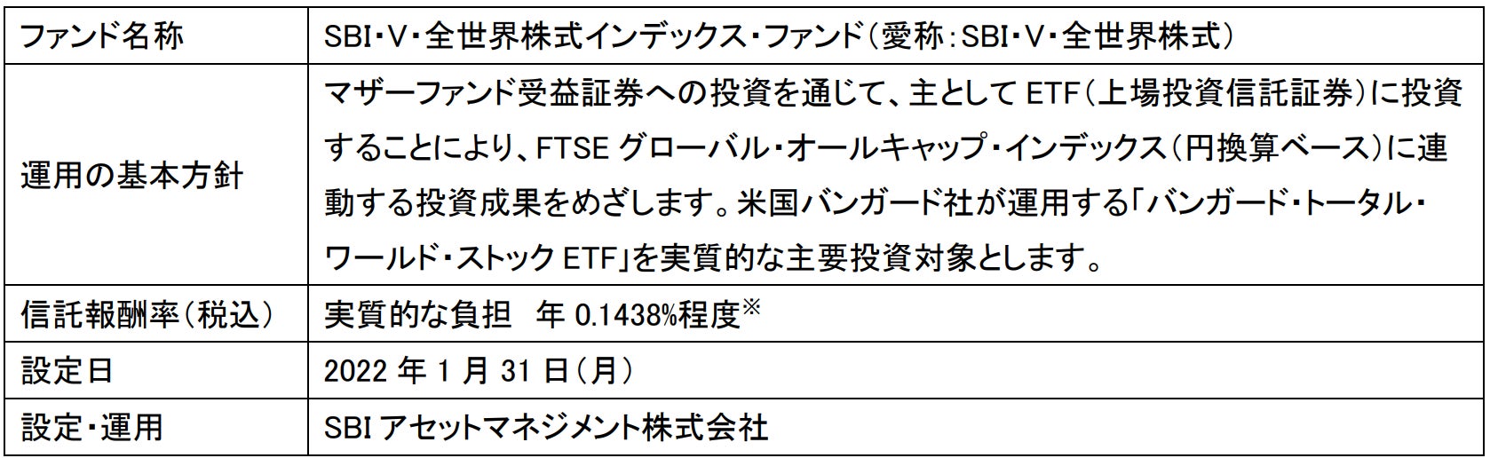 このたび、「顧客中心主義」の経営理念のもと、より幅広い選択肢を提供するべくSBIアセットマネジメントと協同し、2022年1月17日(月)から、新たに「SBI・V・全世界株式インデックス・ファンド(愛称:SBI・V・全世界株式)」の募集を開始します。同ファンドは、米国バンガード社が運用する「バンガード・トータル・ワールド・ストックETF」を実質的な主要投資対象とし、信託報酬率は同一分類のファンドを比較対象とした場合に業界平均を大きく下回る水準※2の0.1438%程度(年率/税込)です。