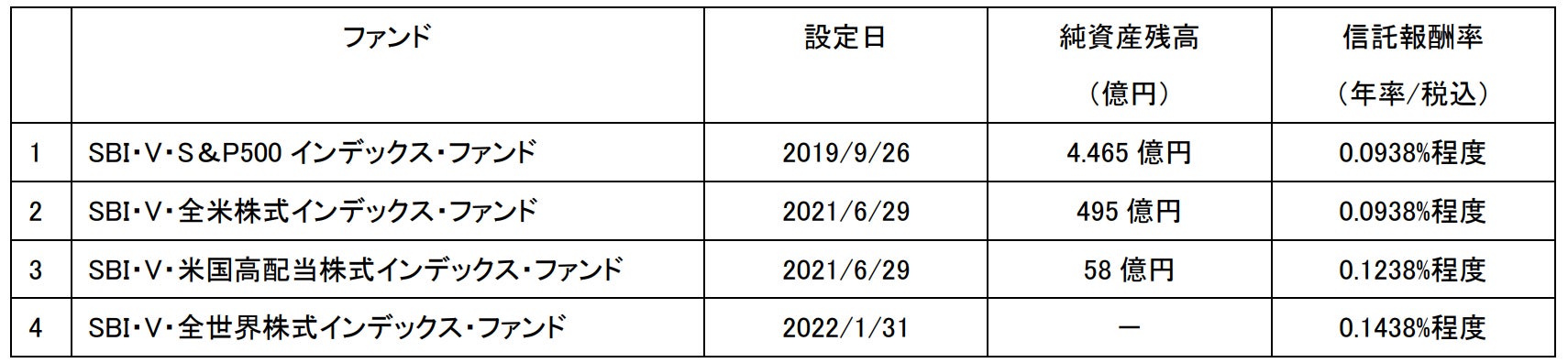 当社は、2019年9月から「SBI・バンガード・S&P500インデックス・ファンド」(名称は当時)の販売を開始しました。2021年6月には、同ファンドを「SBI・V・S&P500インデックス・ファンド」に改称するとともに、新たに「SBI・V・全米株式インデックス・ファンド」および「SBI・V・米国高配当株式インデックス・ファンド」を追加し、「SBI・Vシリーズ」としてシリーズ化しました。同シリーズは、業界最低水準※1の信託報酬率などの特長から、長期・分散・積立投資に適したファンドとして、多くの個人投資家の皆さまから高い評価を得て、現在では純資産残高が5,000億円を超える規模にまで成長しています。