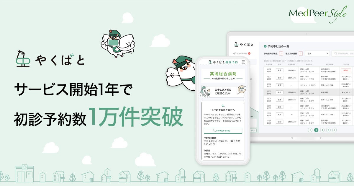 メドピア株式会社(東京都中央区、代表取締役社長 CEO:石見 陽)の連結子会社である株式会社やくばと(東京都中央区、代表取締役:後藤 直樹、以下やくばと)は、2023年7月にサービス提供を開始した基幹病院・中核病院向けのWeb予約申込システム「やくばと病院予約」を活用した患者さまによる初診予約数の累計が1万件を突破しました。