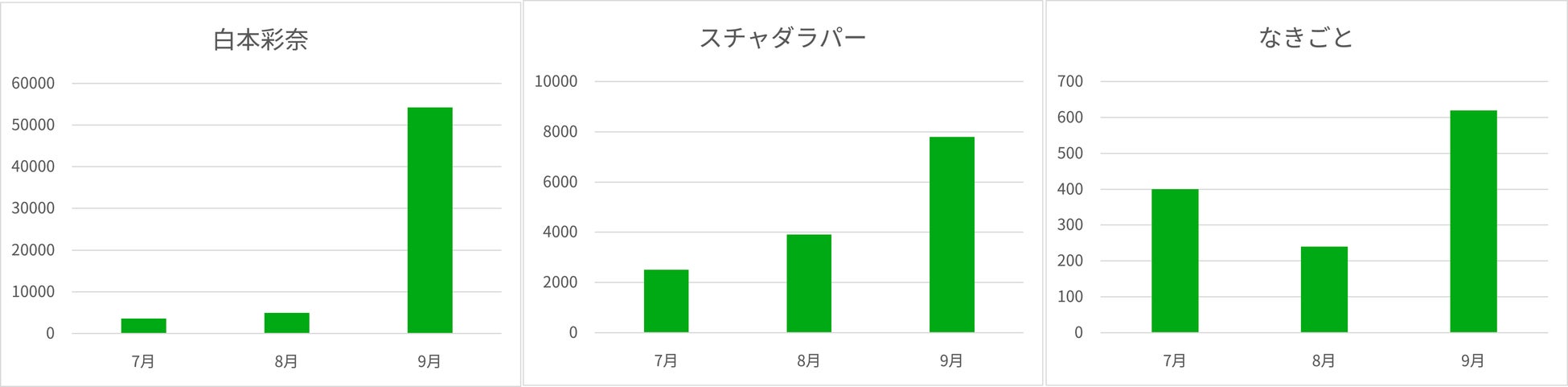 過去3ヶ月間の各出演者関連ワード検索推移についても、それぞれ9月に大きく伸びています。特に白本彩奈さんの検索数は非常に多く、9月に飛躍的に上昇しています。