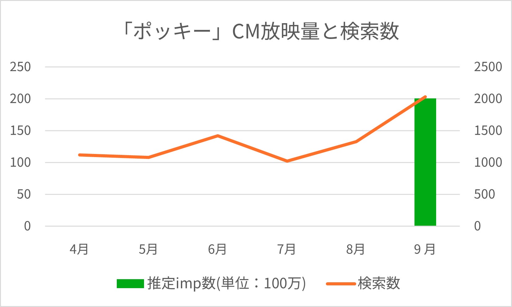 「ポッキー」の検索数とCM放映量を見ると、9月の新CMスタートと同時に、これまでにない大幅な検索数の上昇がみられました。