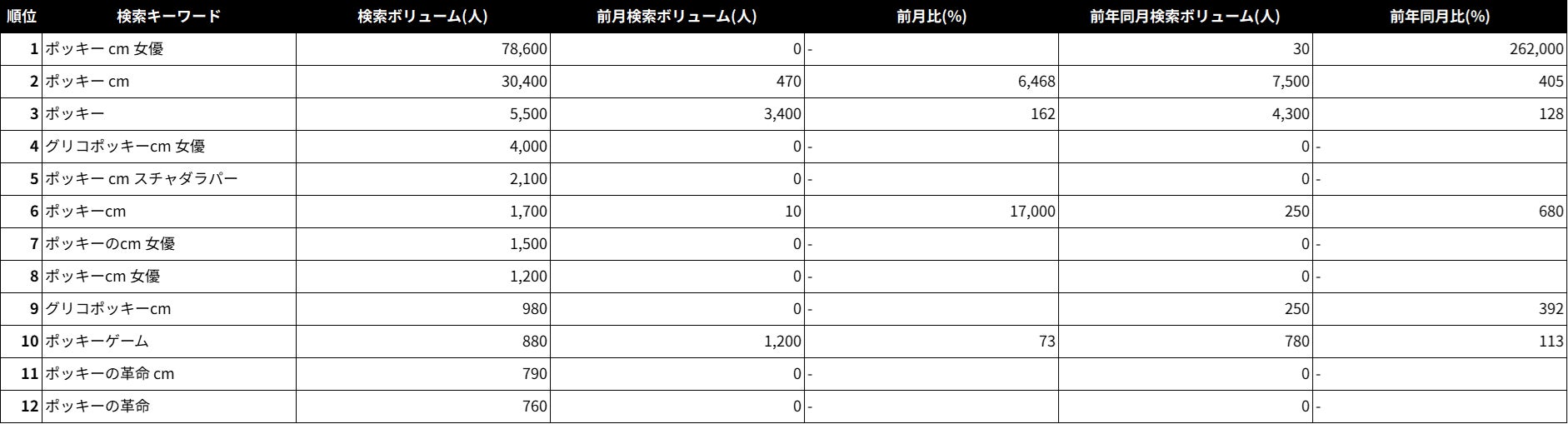 「ポッキー」を検索した人の共起キーワードを見ると、上位にはほぼ「CM」に関連する語が並んでいます。また、「女優」の検索も多く、新たなイメージキャラクターである白本彩奈さんへの注目の高さもうかがえます。