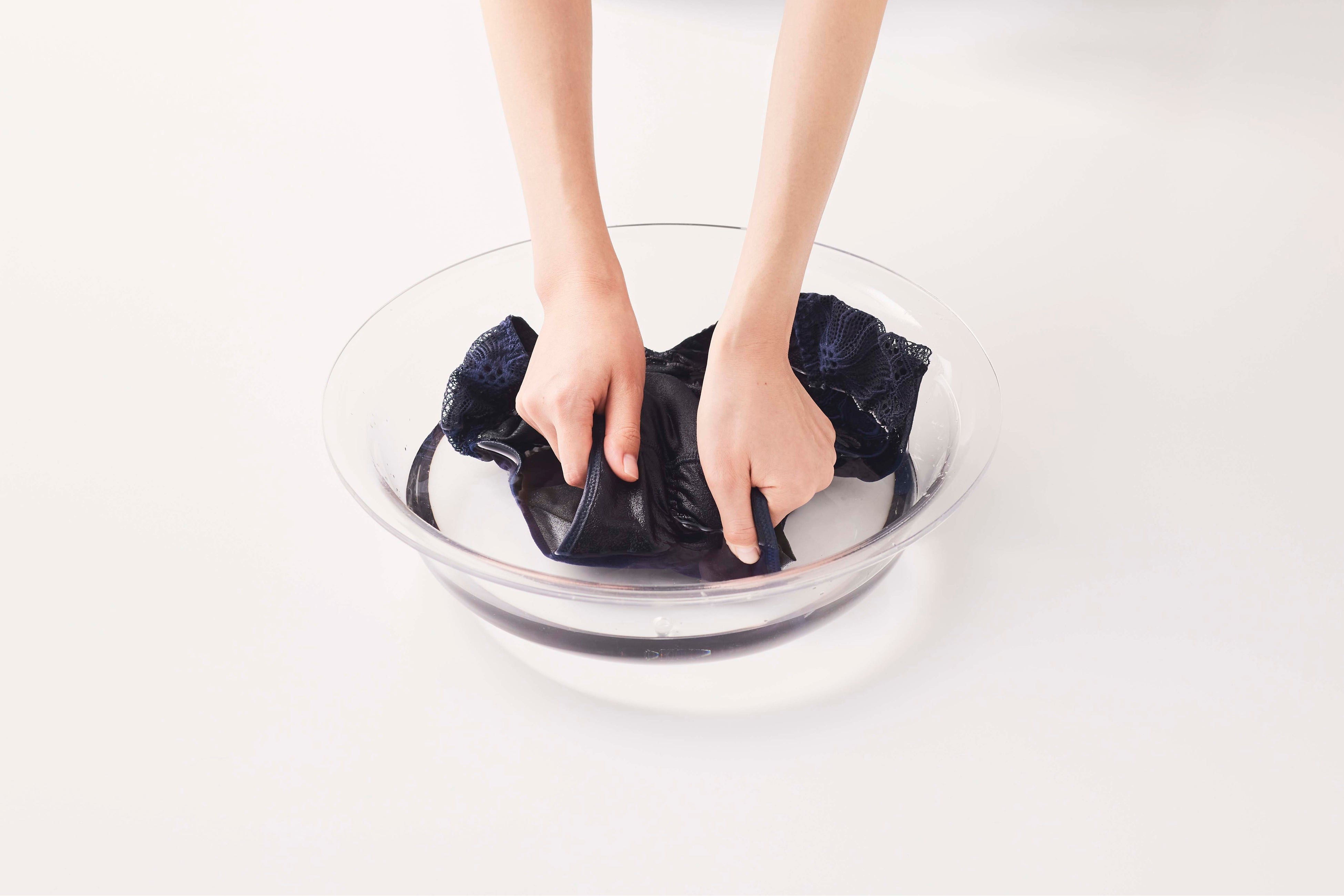 ①ぬるま湯に20分ほど浸し、汚れが出なくなるまで、手で押し出すように優しくもみ洗いします。