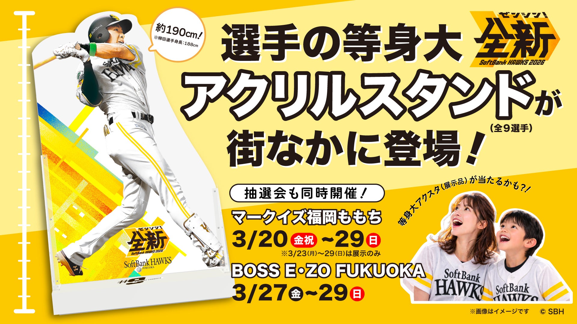 3月20日(金・祝)からホークス選手の等身大アクリルスタンドが福岡市内各所に登場、展示した等身大アクリルスタンドが当たる抽選会も実施