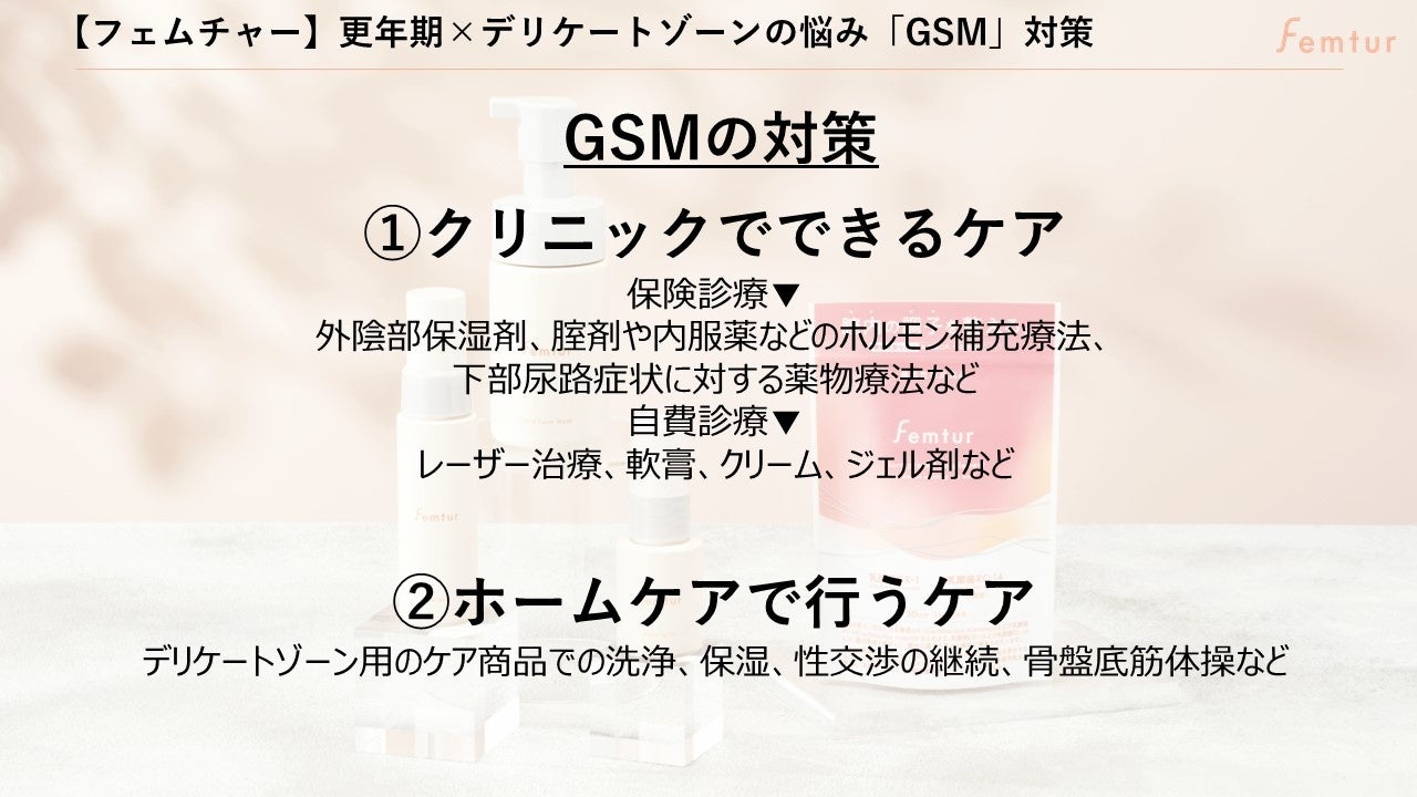 また、あまり知られていない情報の1つとして「GSM」と呼ばれる症状についてもご説明いただきました。「GSM」(別名:閉経関連泌尿生殖器症候群)は、エストロゲンの低下によるデリケートゾーンの乾燥や尿漏れ、性交痛などの症状の包括的名称で、国内ではこのようなデリケートゾーンの悩みを総称で呼ぶことが少ないために浸透していないものであるとのこと。「GSM」の具体的なケアについて伺うと、軟膏やホルモン補充などの処方をクリニックで受けるほか、日頃から専用の洗浄料で優しく洗ったり、オイルやクリームで保湿するなどのホームケアを怠らないことが大切だとお話しされました。