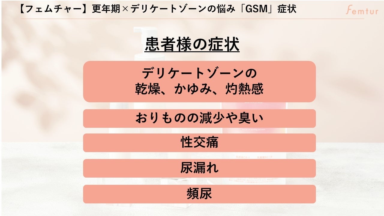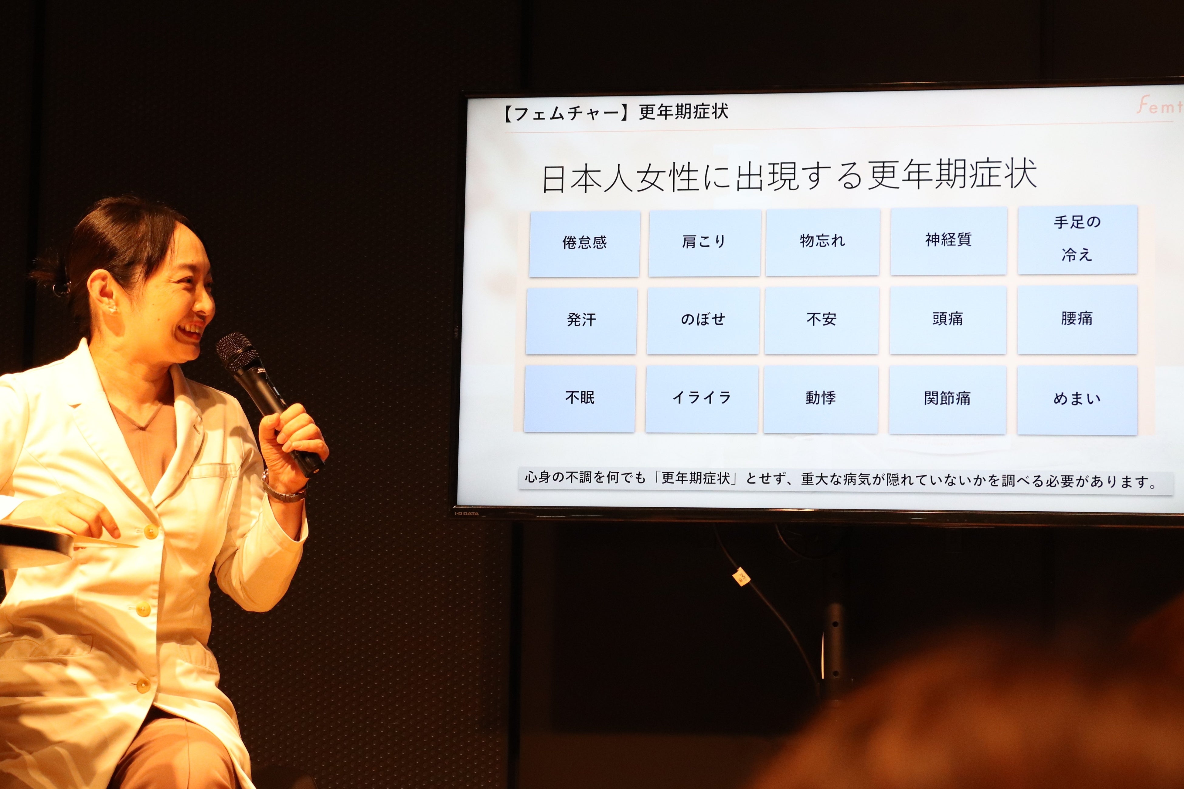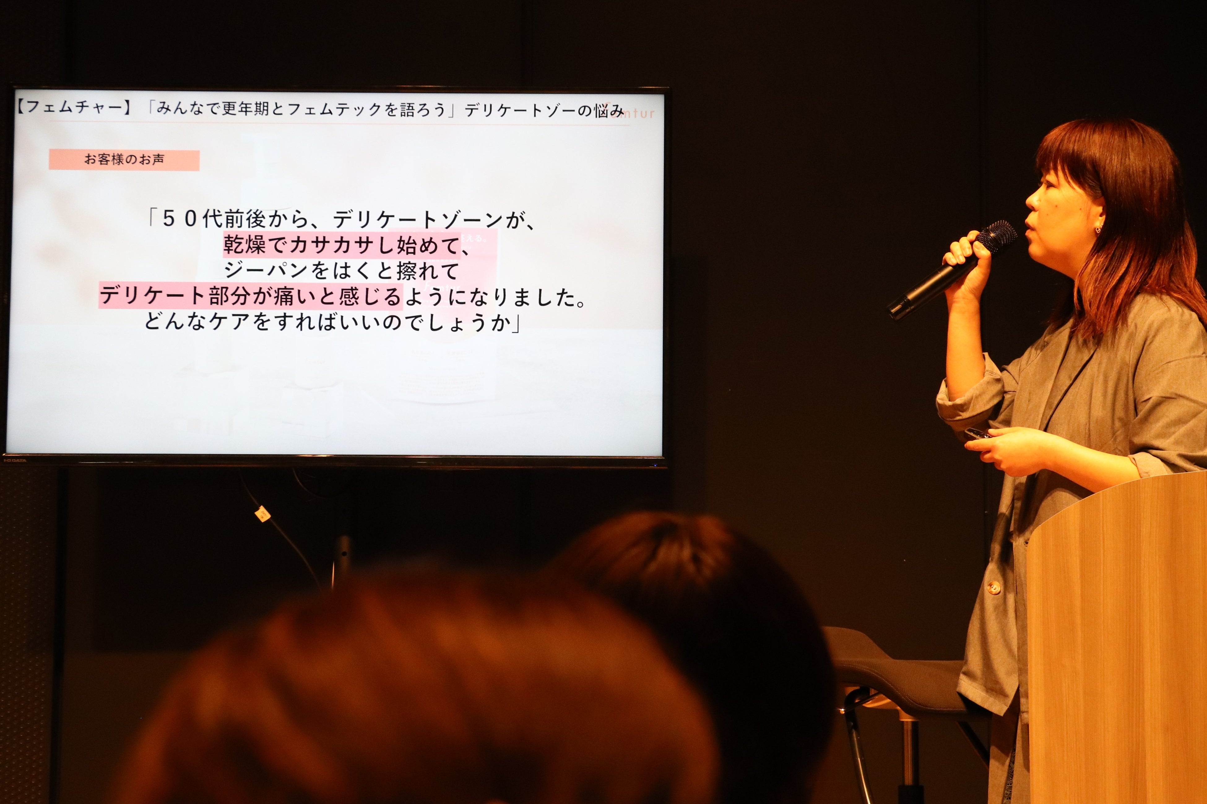 大島医師より、更年期の基本的な知識についてお話しいただいたのち、「更年期とデリケートゾーン悩みの関係」についてトーク。吉岡氏によると、フェムチャーを購入した40~50代のお客様からは「更年期を迎えてからデリケートゾーンの乾燥が一層気になるようになった」という声が複数寄せられているとのことで、中には「デリケートゾーンの痛みがひどく、自転車のサドルに座ることができない」という方もいらっしゃるそうです。