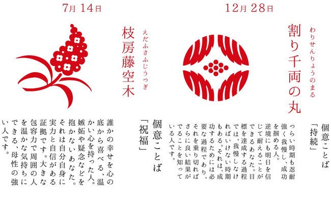 「366日の花ふうかん」専用ページでは誕生日を入力して自分の花個紋を無料で調べることができるサービスも。366種類の花個紋にはそれぞれ「個意ことば」という個別の意味があり、さらに簡単な性格診断まで楽しむことができます。好きなマンガやアニメのキャラクター、お気に入りのアイドルなどの誕生日を入れて楽しむ方も多く、ツイッターではこれまでに42万のいいね、13.5万リツイートを超える大きな反響をいただいております。