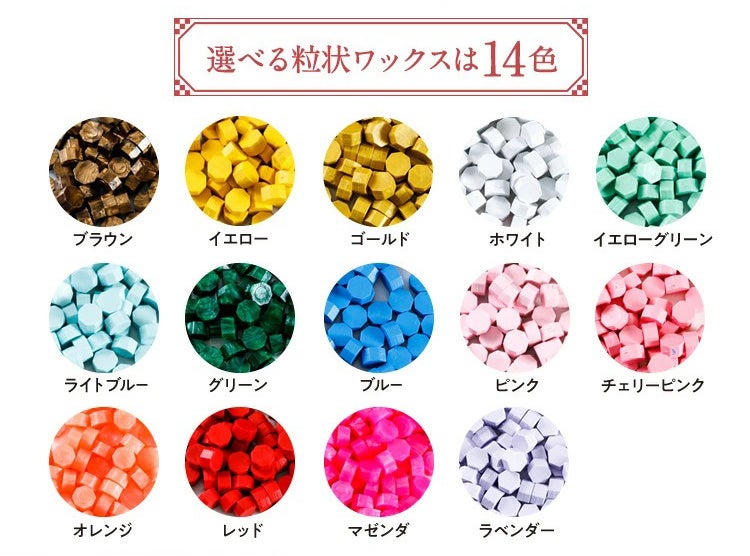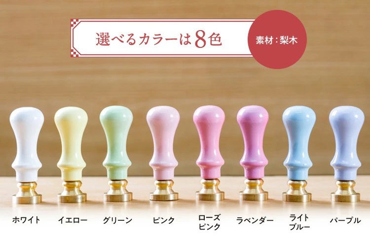 誕生日を選んで「366日の花ふうかん」をオーダーすると、選んだ花個紋を印面に彫刻した真鍮製のおしゃれなシーリングスタンプが届きます。8色から選べるかわいいカラーハンドルと、14色から選べる粒状ワックス50粒、ワックスを加熱し溶かすためのスプーン、選んだ誕生日の花個紋の「個意ことば」と簡単な性格診断が楽しめるミニカード、366種類すべての花個紋が一覧できる冊子がセットで付いています。