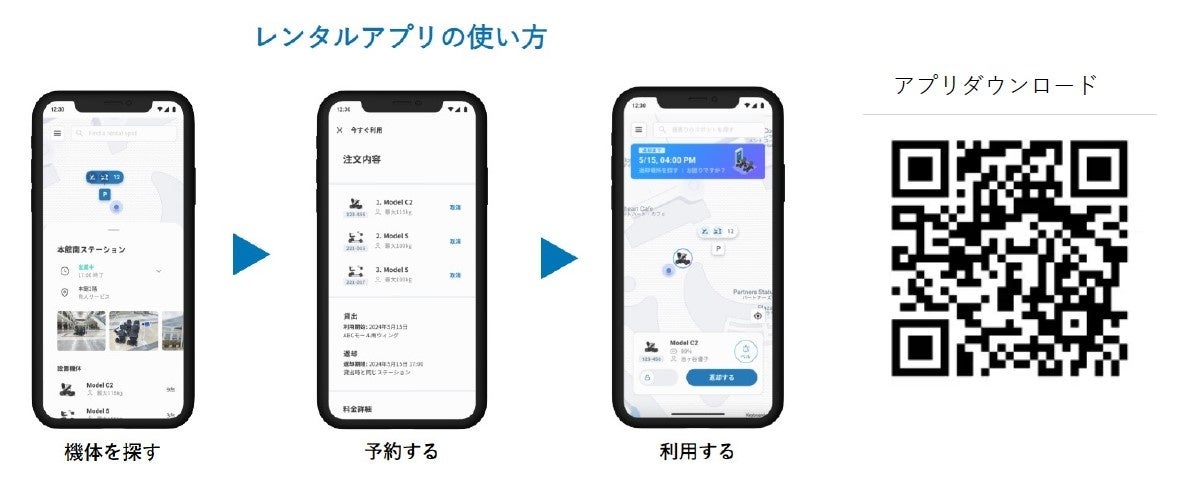 貸出し時は、利用する機体と利用プランを選択して決済完了した上、機体に貼付されたQRコードを読み取ることで解錠、利用を開始します。乗車中はアプリから施錠も可能で、お手洗いや買い物など、機体から一時的に離れる際も安心です。利用後は貸出し場所に機体を戻し、アプリで返却手続きを行います。