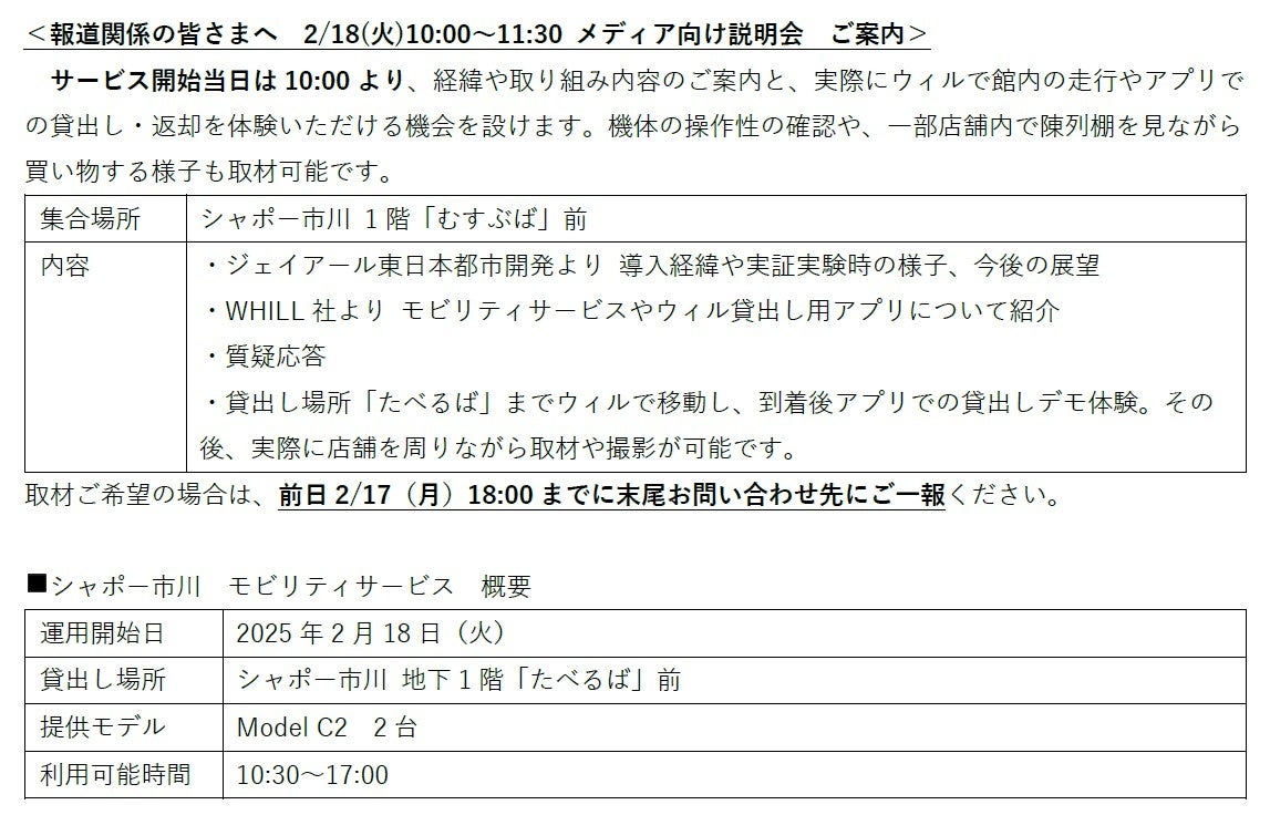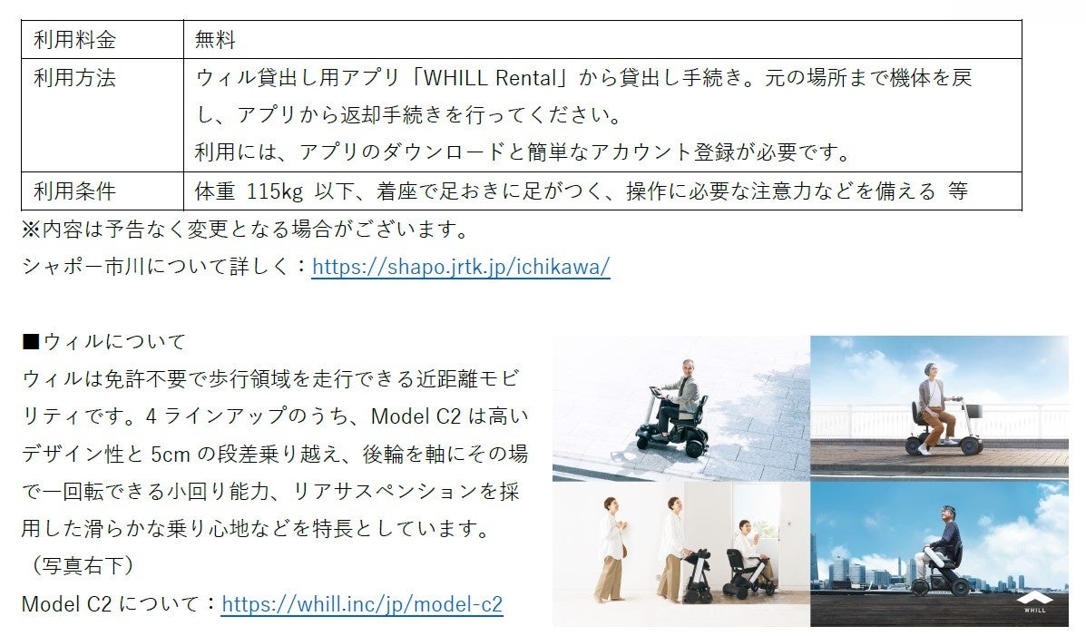 株式会社ジェイアール東日本都市開発(本社:東京都渋谷区、代表取締役社長:根本英紀、以下「ジェイアール東日本都市開発」)とWHILL株式会社(本社:東京都品川区、代表取締役社長 CEO:杉江理、以下「WHILL社」)は2025年2月18日(火)より、ジェイアール東日本都市開発が運営するJR市川駅直結のショッピングセンター「シャポー市川」において免許不要の近距離モビリティWHILL(ウィル)を無料でレンタルできる「WHILLモビリティサービス」を開始します。高齢化や多様化が加速する中、館内で誰もが快適に買い物をお楽しみいただける新しい「買い物」の形を提案し、暮らしに新たな彩りを提供いたします。また、DX推進の一環として「アプリ」で機体の貸出しを行い、お客さまは気兼ねなくウィルをレンタルいただけます。施設側にとっても、貸出しオペレーションを省力化し、お客さまの体験価値向上に注力することができます。