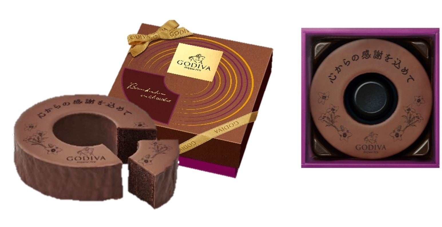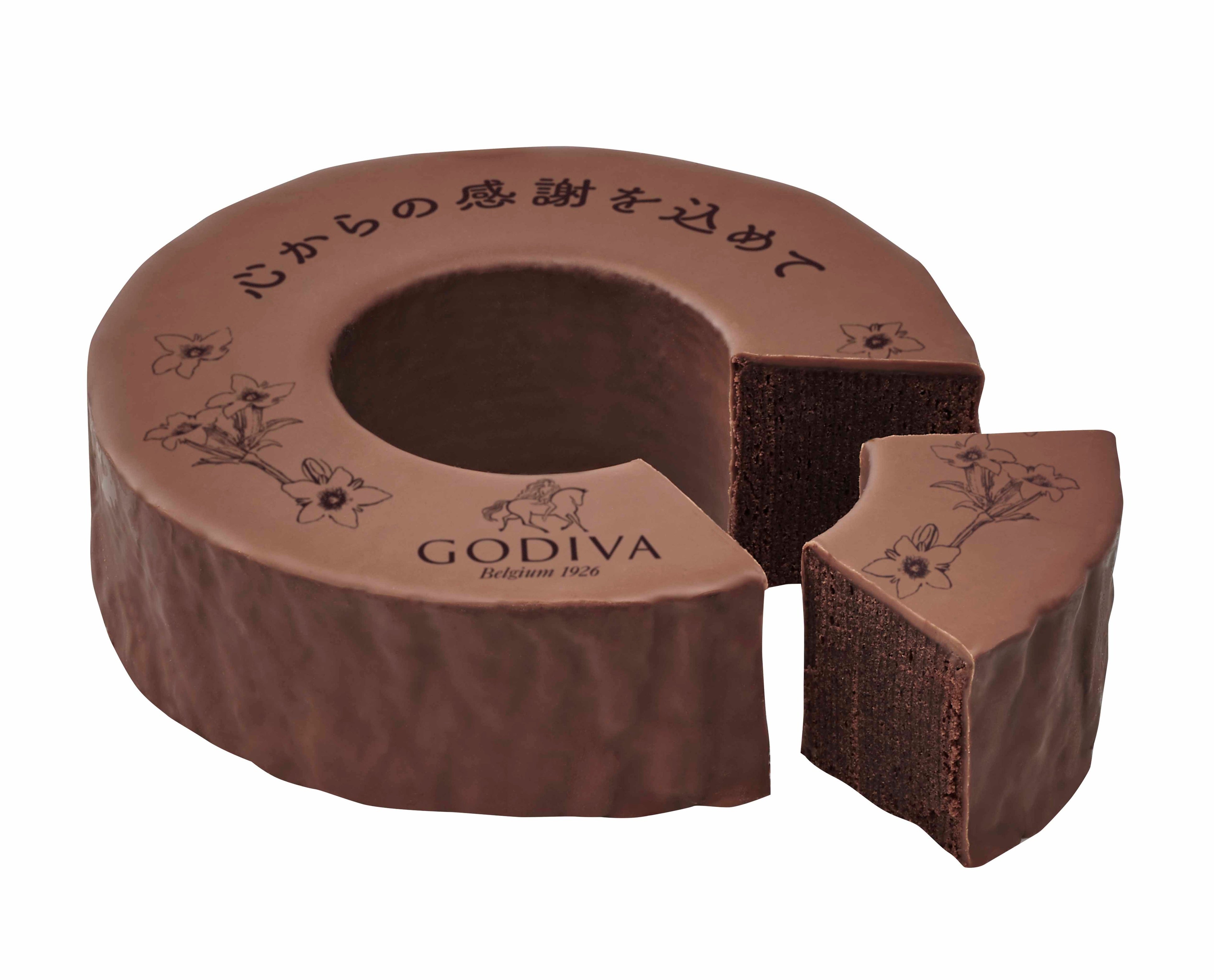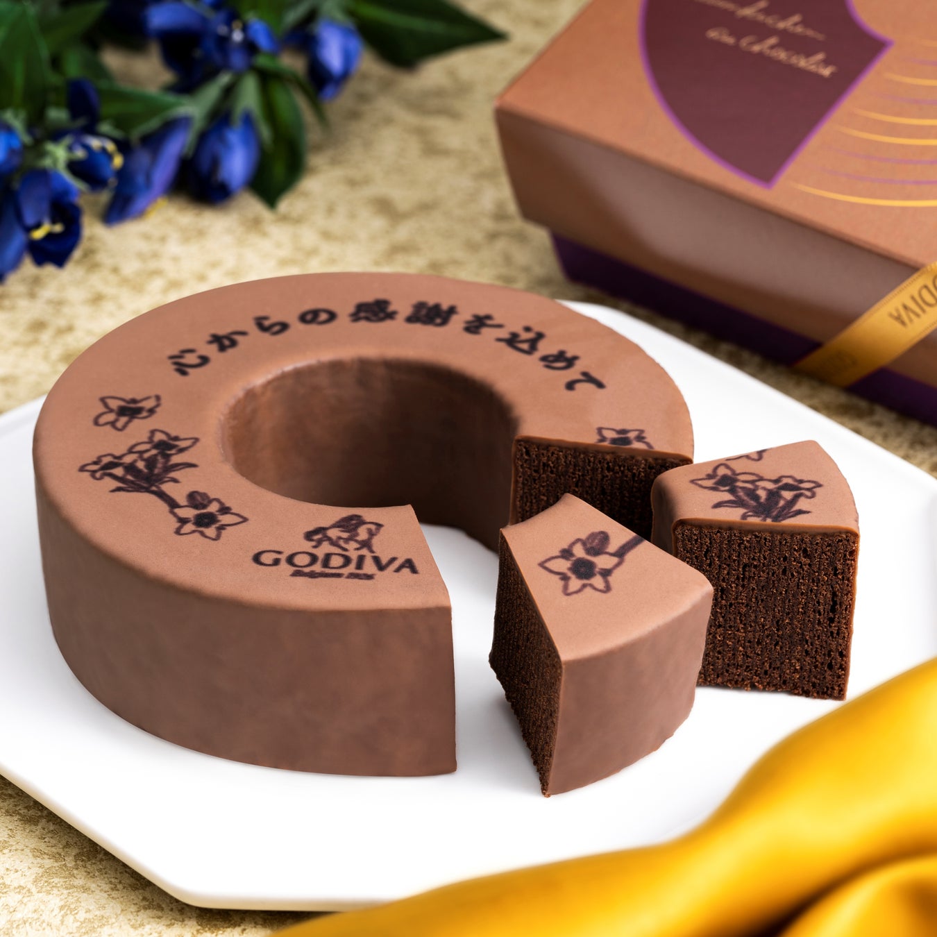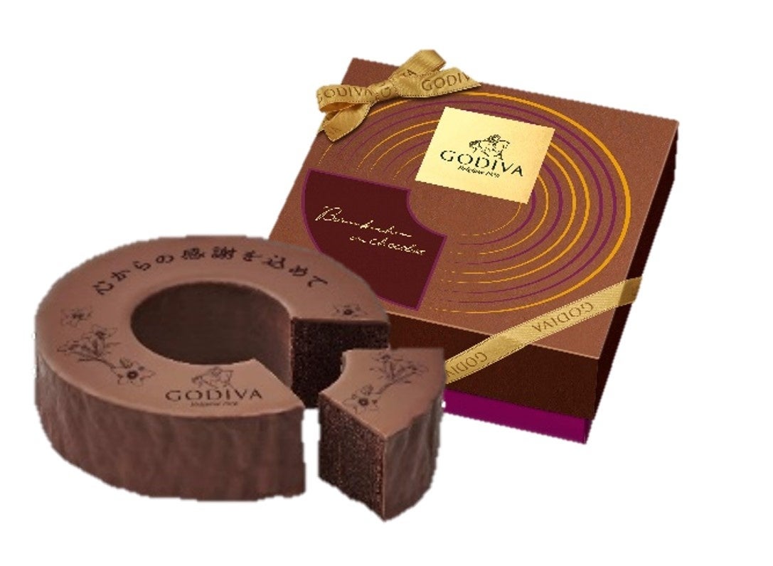 「ゴディバ 感謝のメッセージ入り バームクーヘン オ ショコラ」は、ダークチョコレートと生クリームを練り込んだ生地を一層ずつゆっくりと丁寧に焼き上げました。上質なカカオの風味を味わえるしっとり濃厚なバームクーヘンです。ご家族で召し上がっていただくシーンにもおすすめの3、4人でシェアできるサイズです。天面には、日ごろの感謝の気持ちを込めたメッセージと、健康と長寿を願う意味で贈られる「りんどう」の花をデザインし、パッケージには用途を選ばず感謝の気持ちを込めたギフトとして使いやすい金色のリボンをかけています。