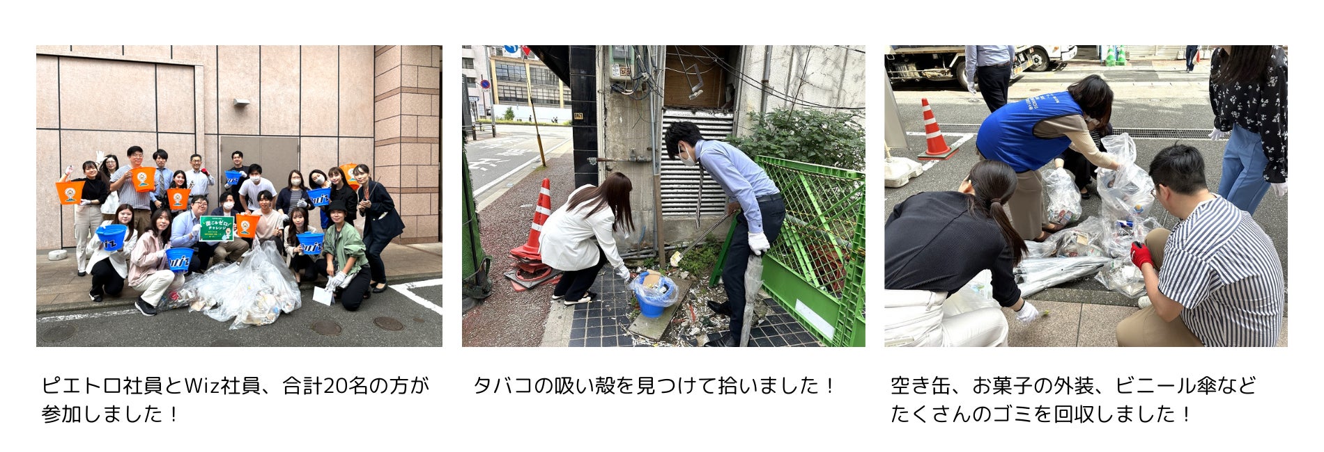 「街ごみゼロ!チャレンジ」とは、毎年5月30日から始まる環境デー「ごみ減量化推進週間」にちなんで始まった、ピエトロとWizによるコラボ地域清掃プロジェクトです。協働活動によって、地域社会の美化や環境保全などのSDGsに関する意識をより高めていきたいという目的のもと、福岡市天神に本社ビル「ピエトロビル」を構えるピエトロと、当ビルのテナント企業であるWiz・福岡支社が力を合わせ、福岡市天神周辺を清掃しました。