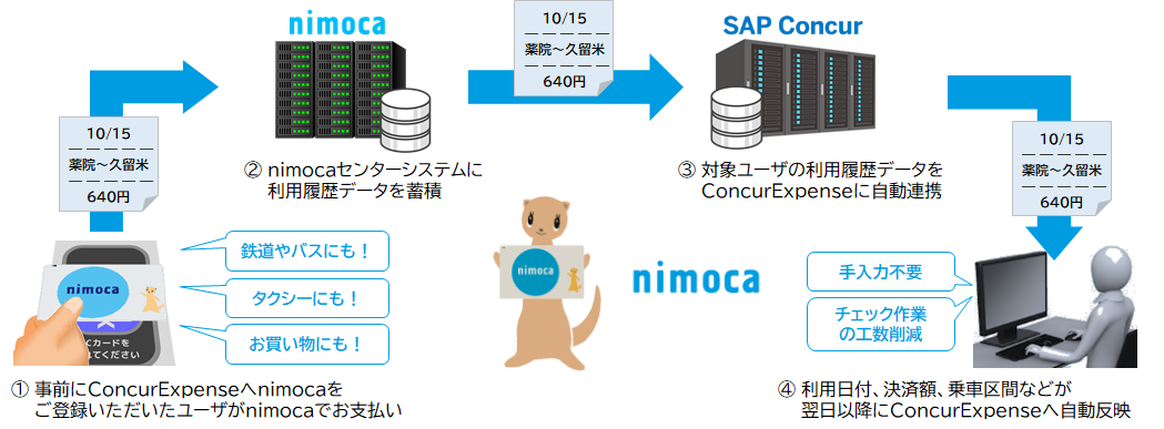 本サービスは、「Concur Expense」のユーザー企業を対象としたサービスで、従業員の方がnimocaで乗車した鉄道・バスのほかタクシーやコインパーキング等の利用履歴データが、最短で乗車翌日にConcur Expense に自動で連携されます。経費精算を行う際の従業員側の負担軽減や申告漏れ・不備のリスクが回避できるほか、データの改ざんが不可能であるため、承認者や経理担当者によるチェックの負担が大幅に軽減されます。