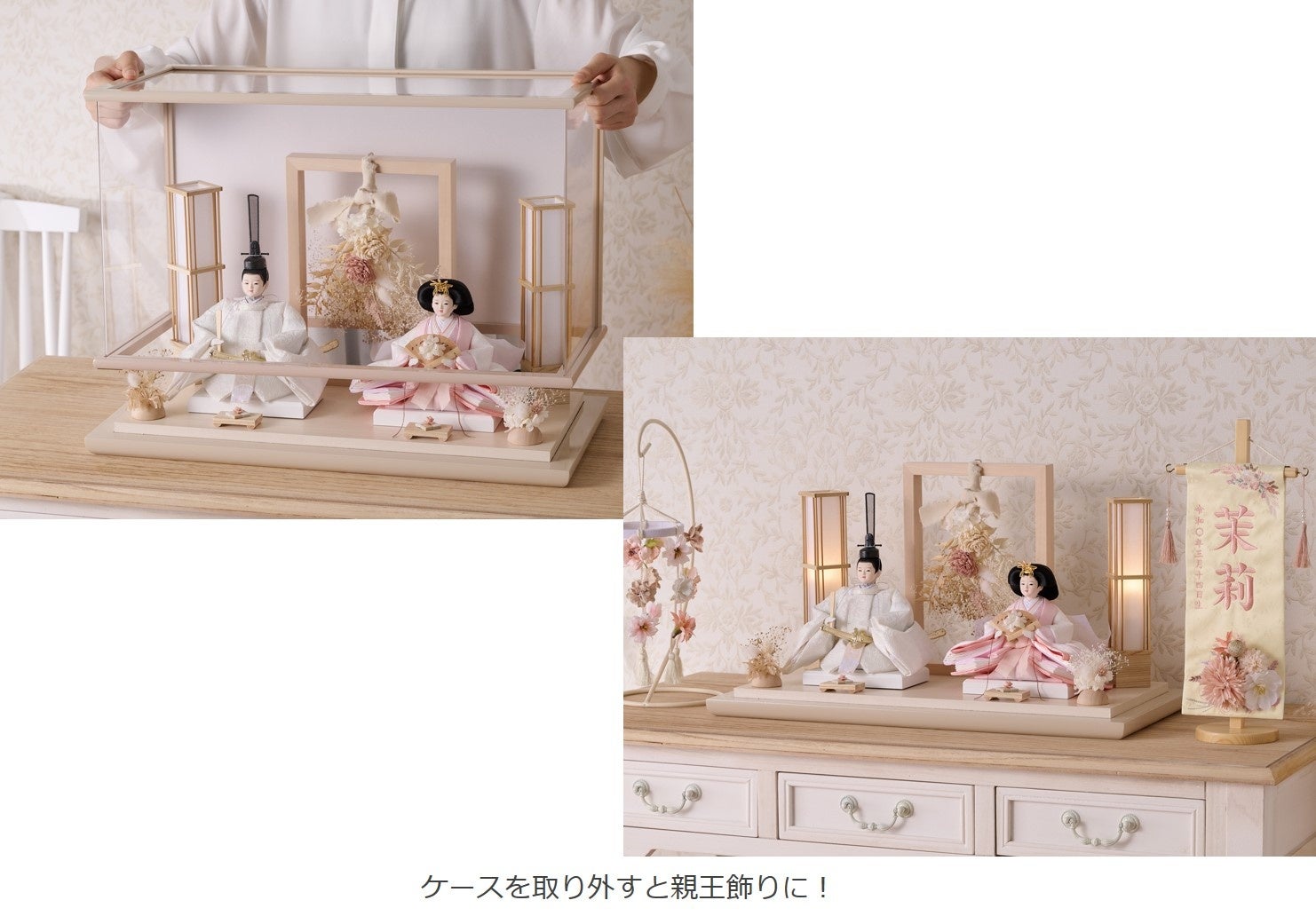 ケース飾りとしても親王飾りとしても飾っていただけます。ケースを外しても背面が残るので綺麗に飾れます。