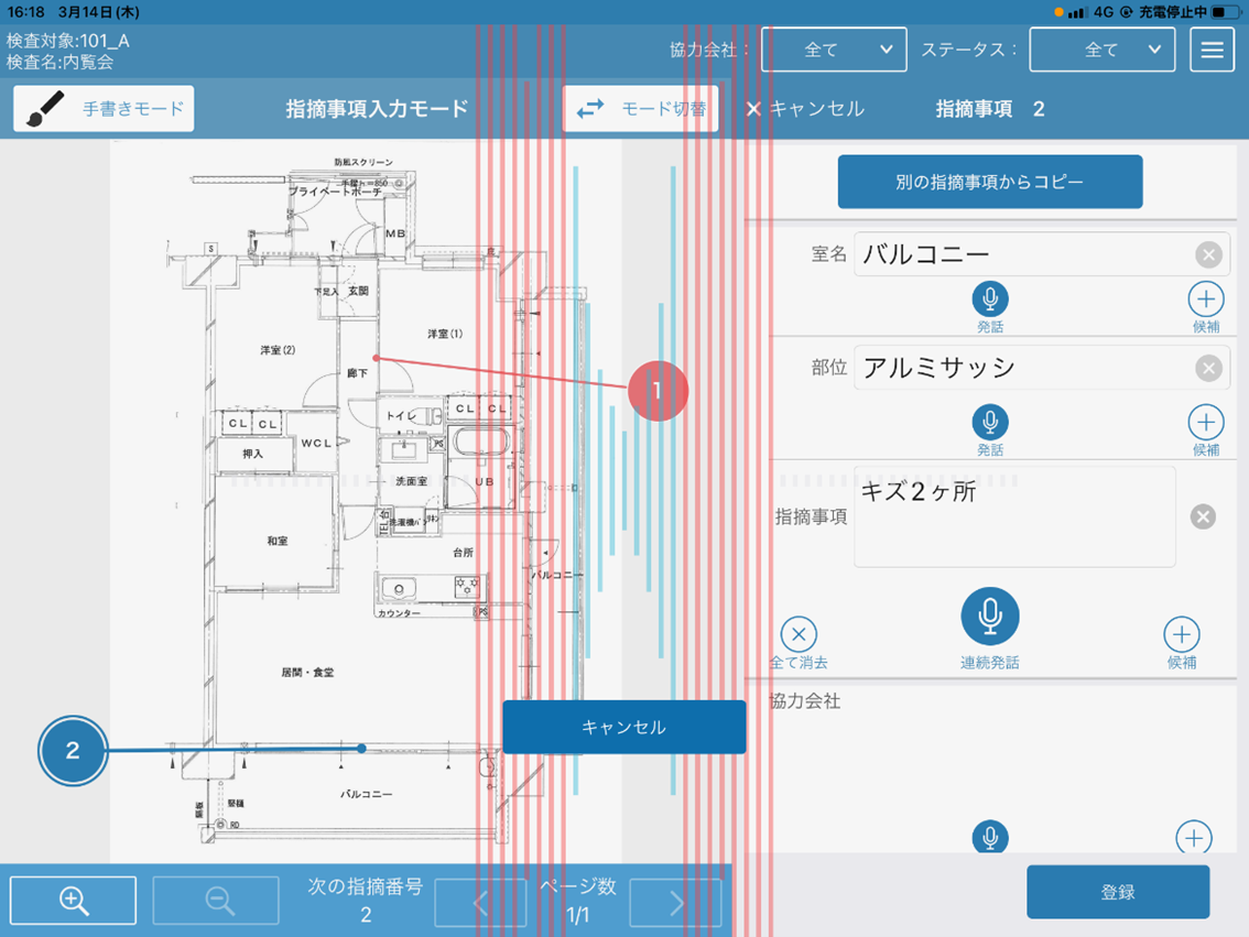 導入により、図面上で指摘事項を入力したい箇所をタップし、該当箇所、詳細な部位、購入者からの指摘内容を「バルコニー、アルミサッシ、キズ2ヶ所」のようにタブレット端末に話しかけるだけで簡単に音声入力することが可能になりました。また、オフライン環境においても入力は可能なため、タワーマンションなどの高層階でもご利用いただけます(※2)。