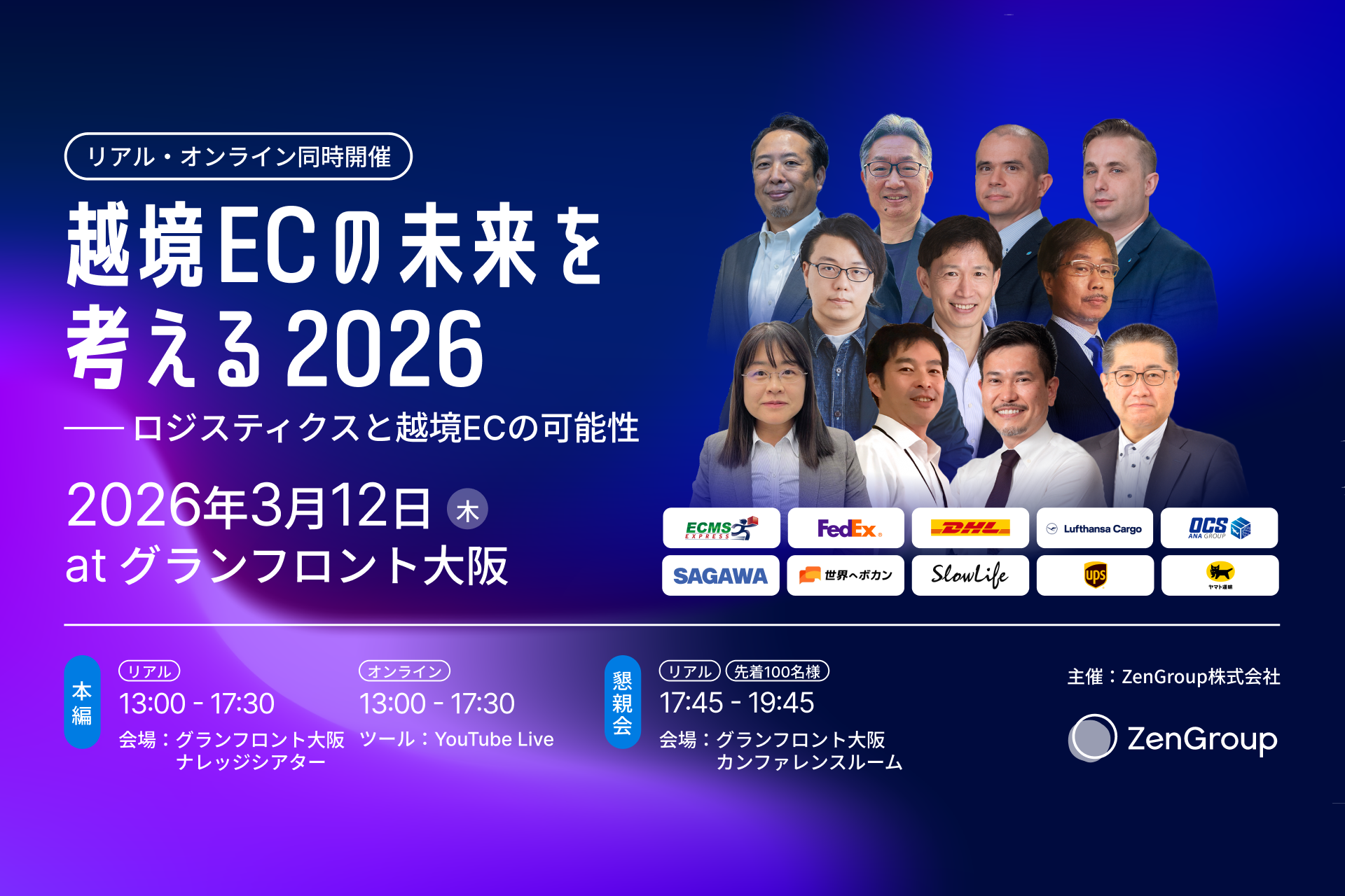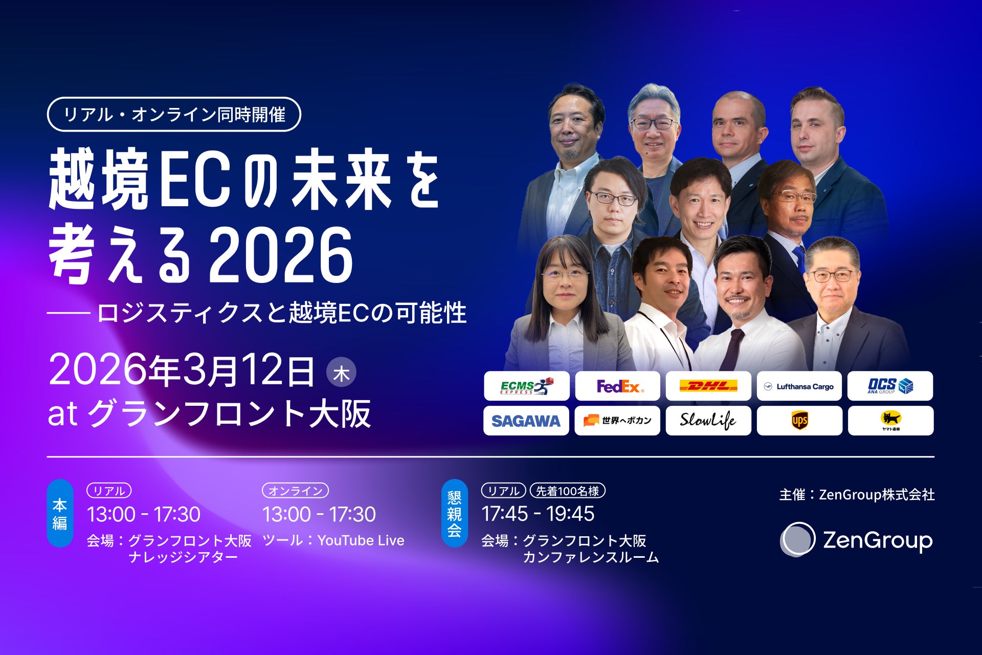 越境ECをトータルで支援するZenGroup株式会社(本社:大阪府大阪市)は、2026年3月12日(木)、グランフロント大阪にて「越境ECの未来を考える2026-ロジスティクスと越境ECの可能性」を開催します。