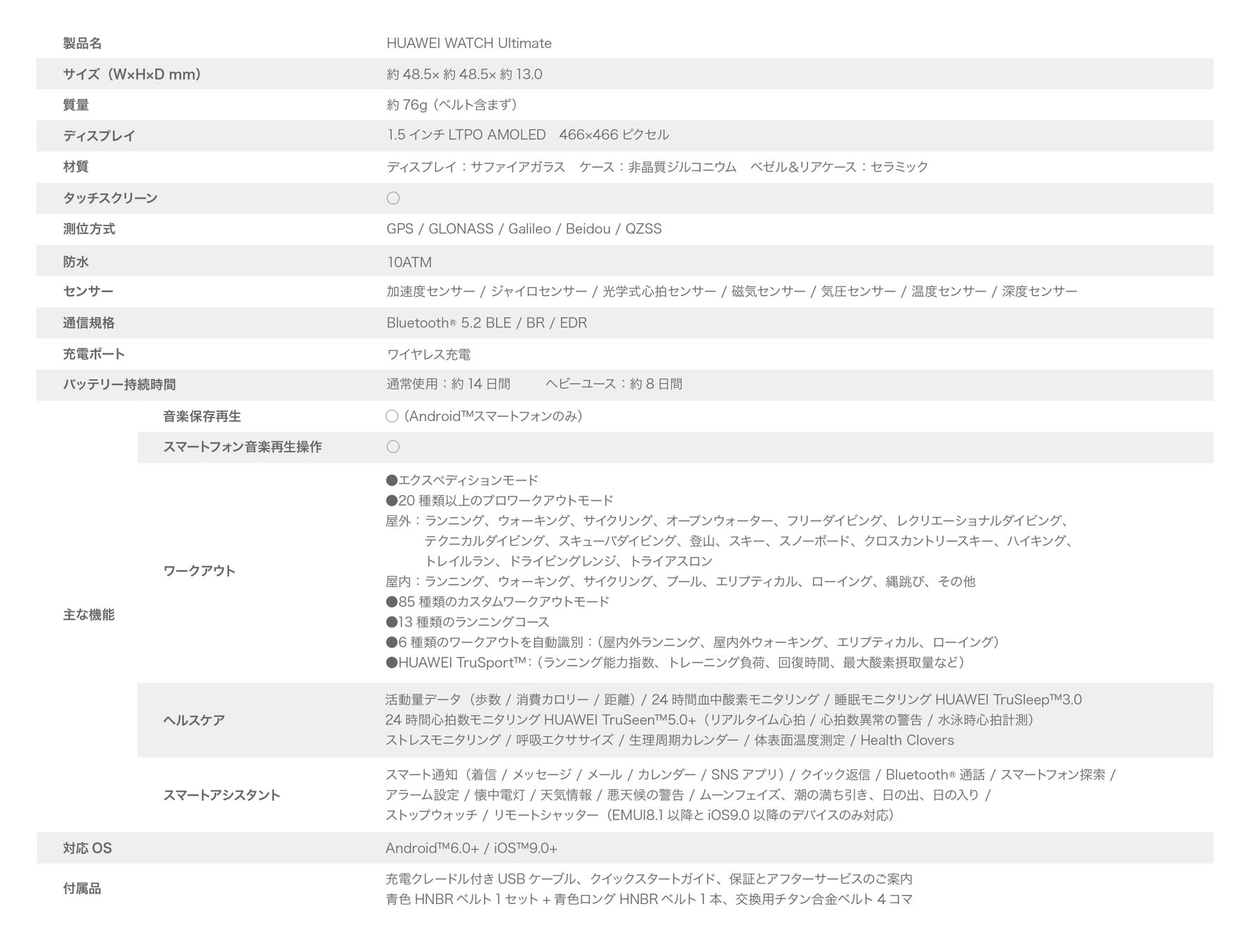 『HUAWEI WATCH Ultimate』 の主な仕様