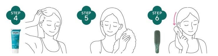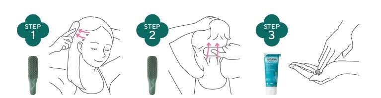 下から上へ向かって、地肌に直接すり込みます。指の全体を使って生え際から頭頂部に向かって地肌に下から上へ、直接塗り込みます。うなじや後頭部も同様に行い、毛穴に馴染ませるように頭皮全体に塗布します。ブラシを使ってSTEP1のように下から上に、地肌の毛穴の奥の汚れをかきだすイメージで使います。