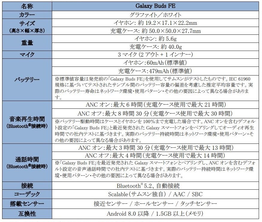 <主な仕様:「Galaxy Buds FE」>