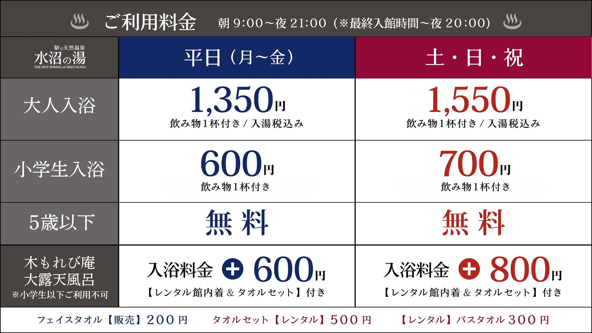 土日祝 大人1,550円 / 小学生700円 / 5歳以下 無料