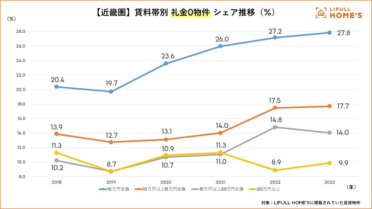 賃料10万円未満の物件でも直近(2023年)のシェアは27.8%に留まっており、近畿圏において礼金0物件は少数派といえそうです。