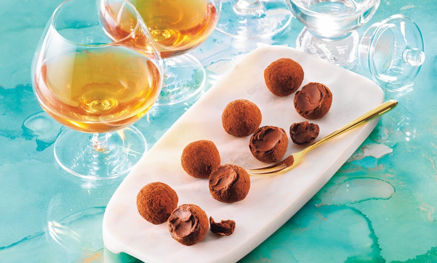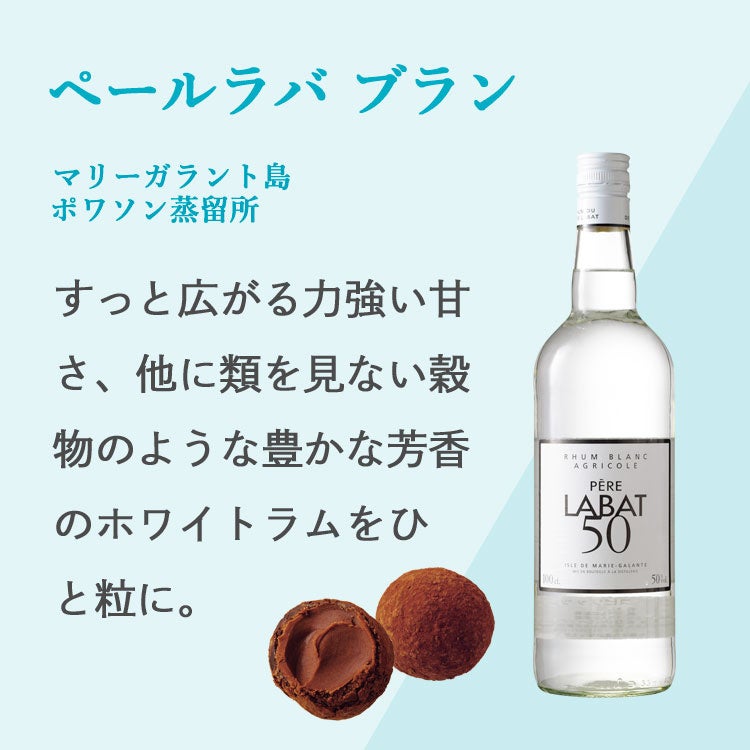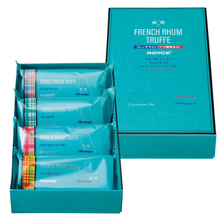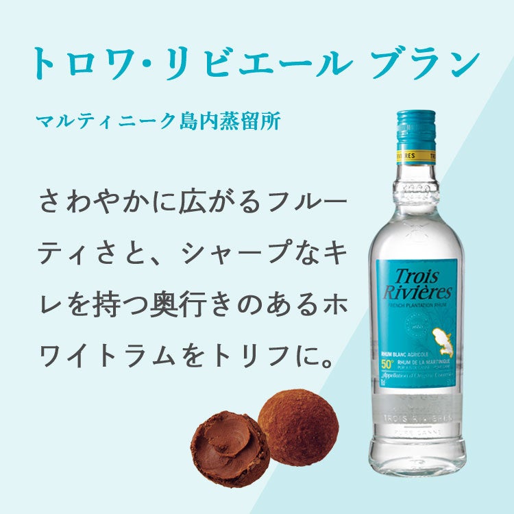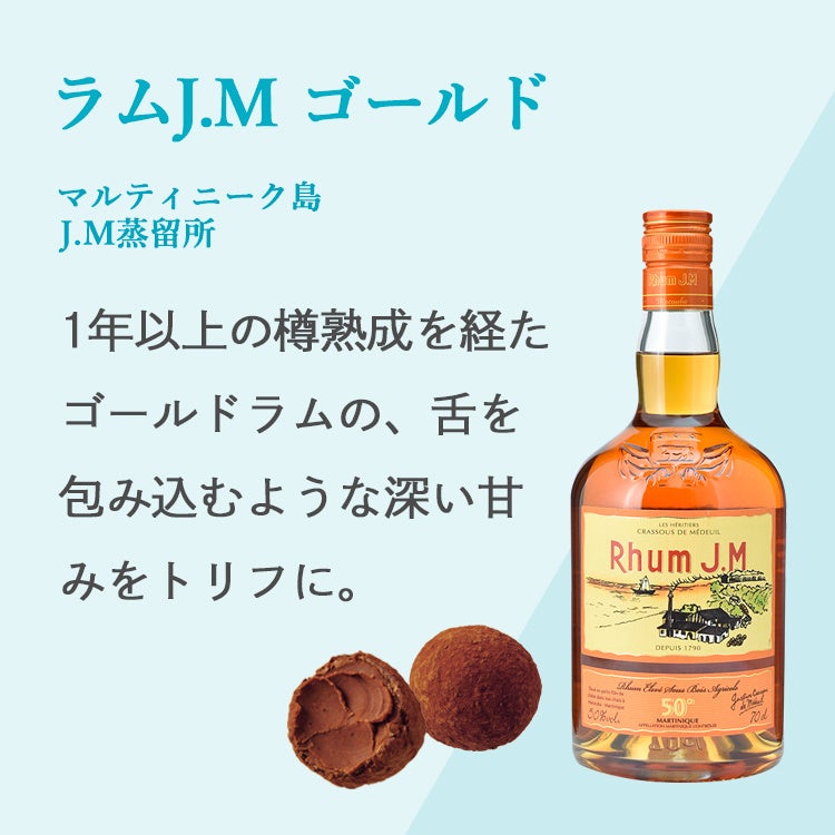 カリブ海に浮かぶフランス海外県の島々で造られるフレンチラム(※)「ラムJ.M ゴールド」「ラムJ.M XO」「トロワ・リビエール ブラン」「ペールラバ ブラン」を、4種類のトリフに。ガナッシュにはカカオ感や甘さのバランスを整えたチョコレートを使用し、ラム酒の香りを引き立たせています。ラム酒の風味の違いを存分に味わっていただくために、4種類のトリフのレシピはラム酒以外は同じにしています。それぞれのフレンチラムの個性が引き立つこだわりのトリフを心ゆくまでご堪能ください。