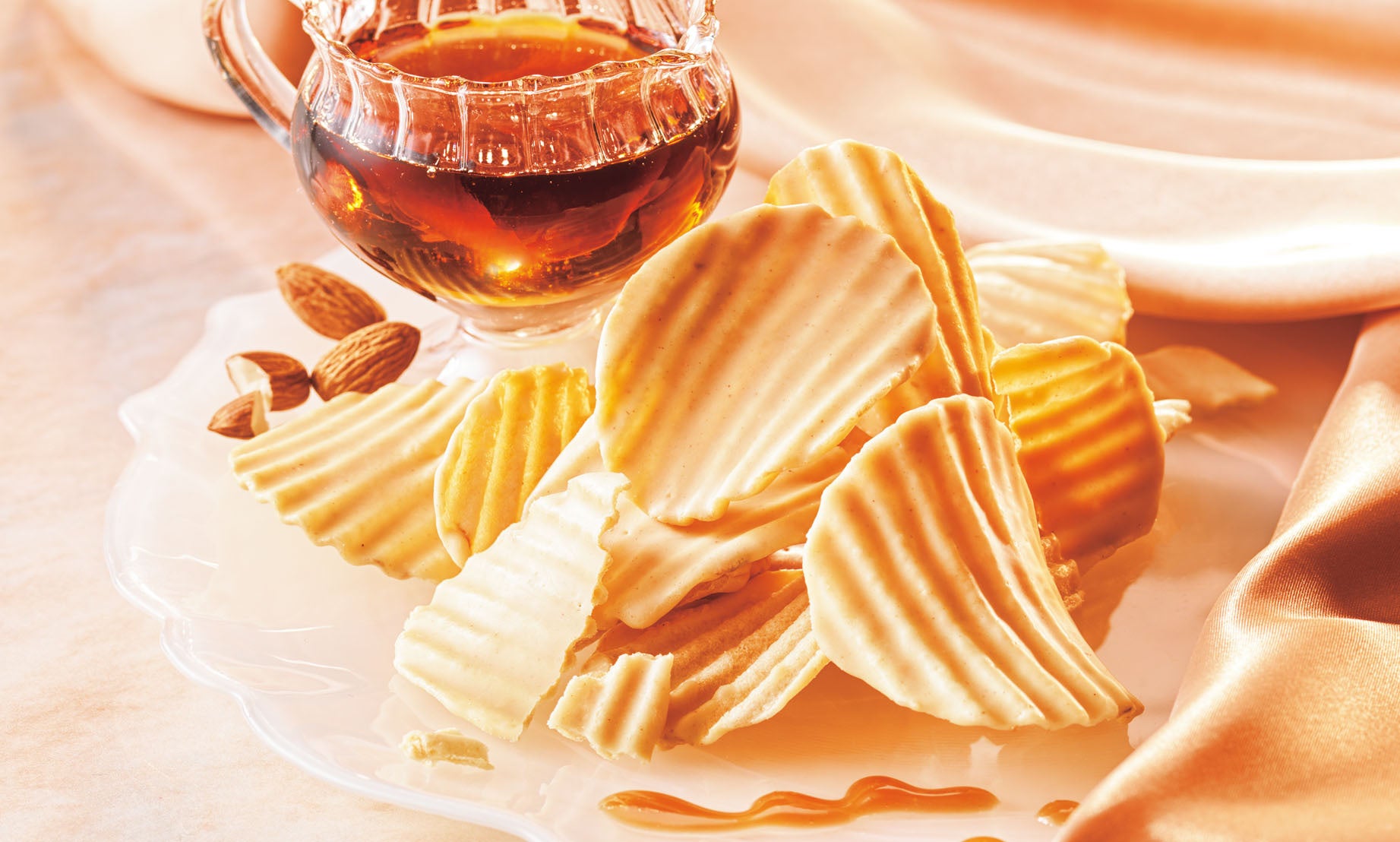 メープルシュガーとアーモンドプラリネペーストを加えたチョコレートを、パリッとしたポテトチップの片面にコーティングしました。ほんのり塩味のポテトチップとやさしいメープルシュガーの風味が絶妙なバランスの、手が止まらなくなるおいしさです。後味にほんのりナッツが香ります。毎年人気の季節限定のおいしさを、この冬もぜひお楽しみください。