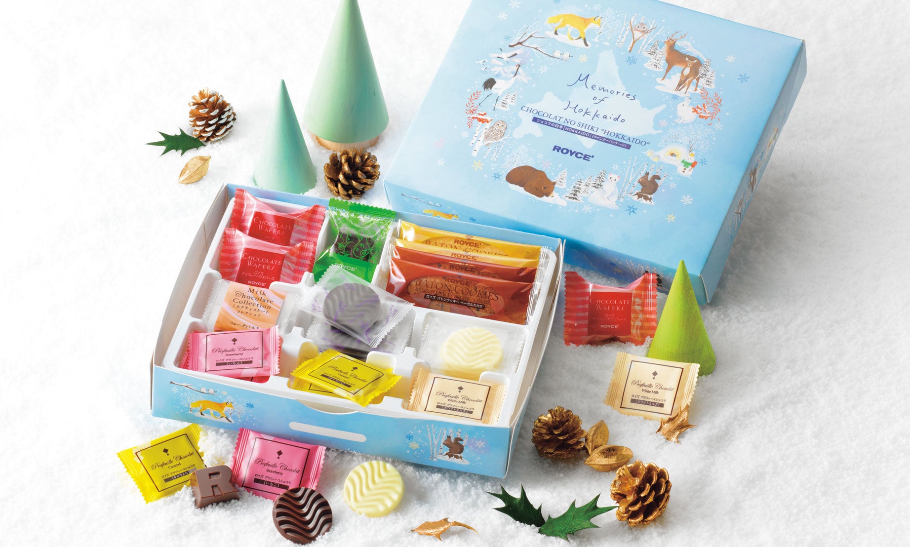 色や素材から北海道の四季をイメージできるチョコレートをセレクトした人気の詰め合わせが、冬季限定のデザインになって登場。北海道に暮らす動物たちが描かれたかわいらしいパッケージで、冬のギフトにおすすめです。