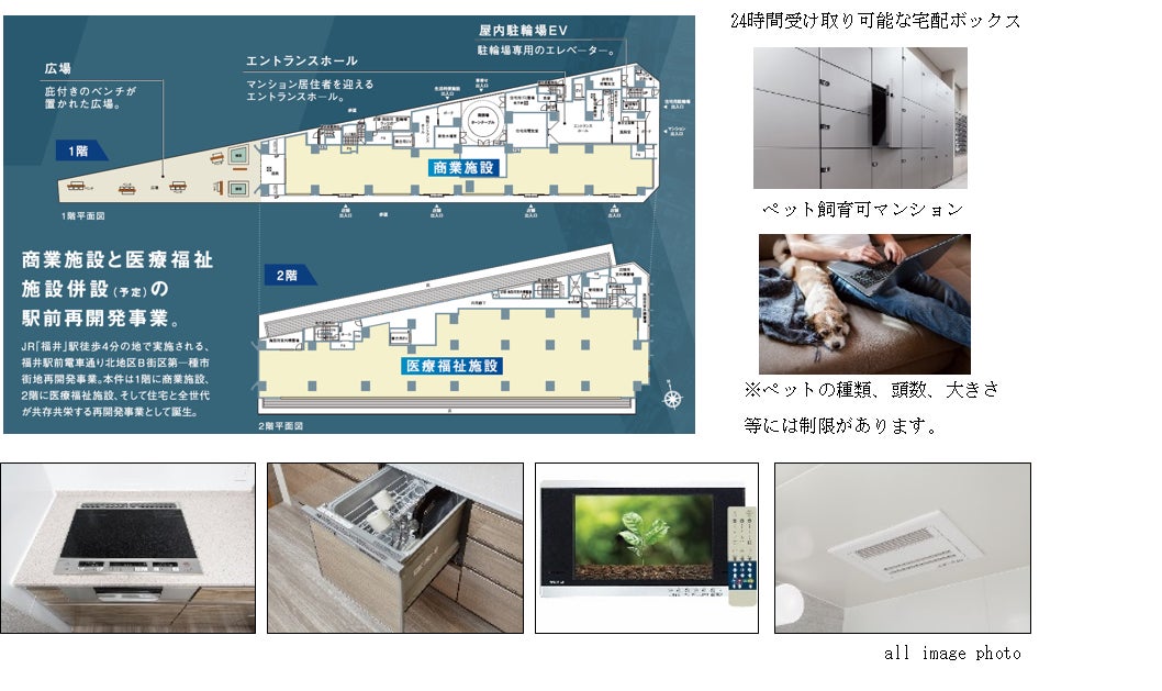 本物件は、1階に商業施設、2階には医療福祉施設が予定されています。駐輪場は屋内に完備されており、3階の駐輪場まで専用のエレベーターを利用できる他、共用部には宅配ボックスも設置しました。オール電化採用マンションで、安心な生活をサポートします。