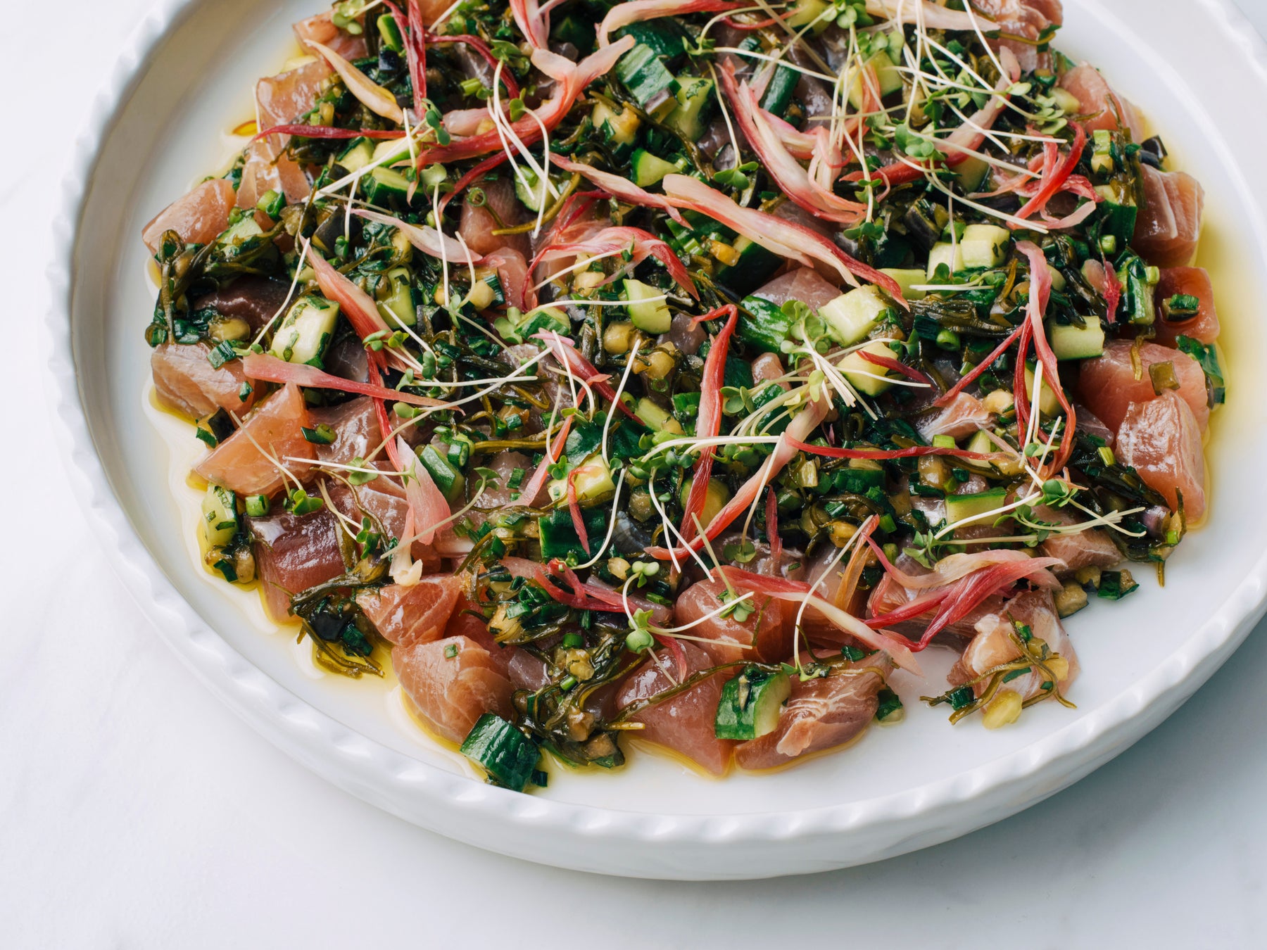フレッシュなマグロをたっぷりの刻んだ夏野菜や香味野菜で味わう、和風仕立てのカルパッチョ。うまみが凝縮されたマグロに、なす、きゅうり、万能ねぎ、納豆でつくった山形だしを掛け、みょうがの甘酢漬けをあしらいました。