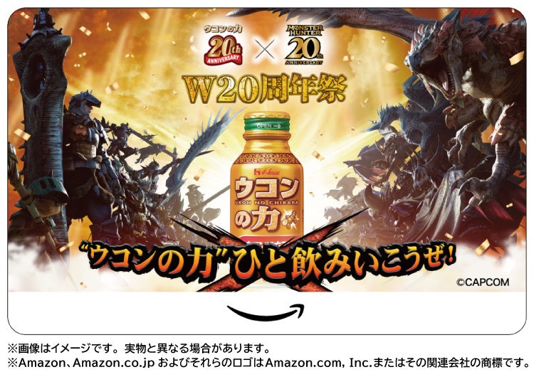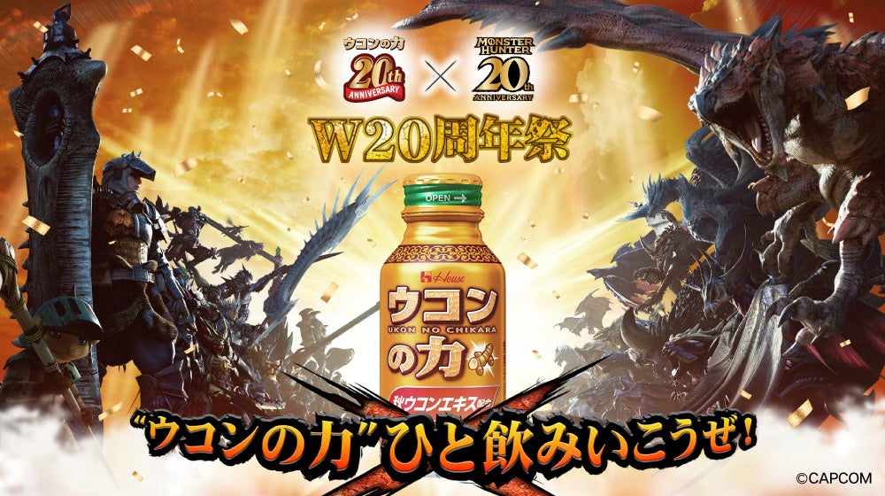 ハウスウェルネスフーズ株式会社が販売する「ウコンの力」は、皆さまの交流の場にそっと寄り添い続け、おかげさまで今年20周年を迎えることができました。それを記念して、同じく20周年を迎えました、株式会社カプコンから発売されている大自然の中で巨大なモンスターに立ち向かうハンティングアクションゲーム「モンスターハンター」シリーズとコラボして、「“ウコンの力”ひと飲みいこうぜ!W20周年祭」ウコンの力購入キャンペーンを7月1日(月)から9月30日(月)まで開催します。