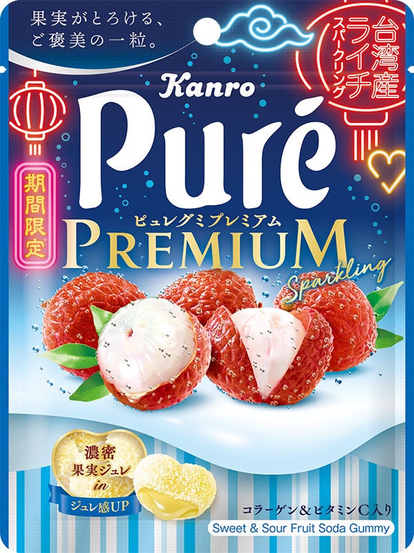 「ピュレグミプレミアム台湾産ライチスパークリング」は、ライチの代表的な産地であり“美食の街”としても有名な、台湾産のライチ果汁をたっぷりと配合しました。こちらも5月から旬がはじまり、夏の人気フルーツとして親しまれています。シュワっと弾けるスパークリング感とフルーティーでみずみずしいライチの味わいを、台湾のネオン街をイメージしたパッケージとともにお楽しみください。