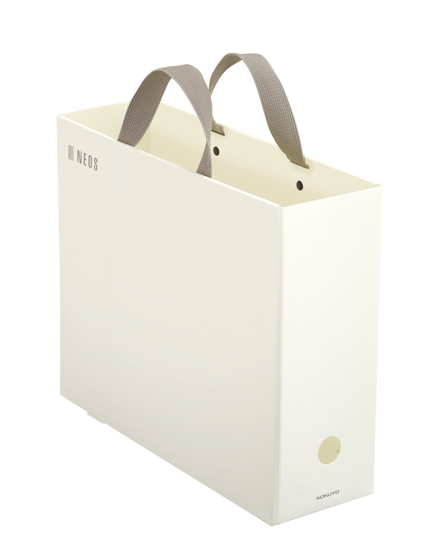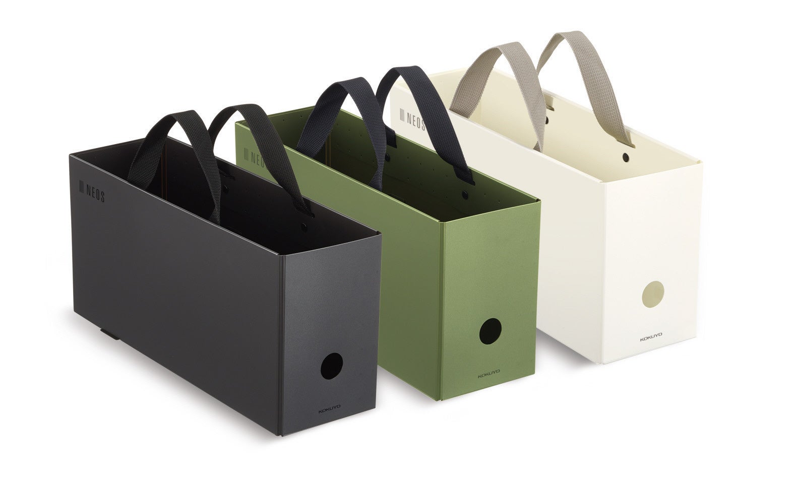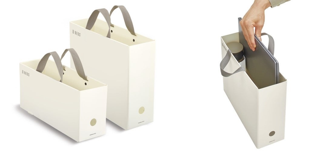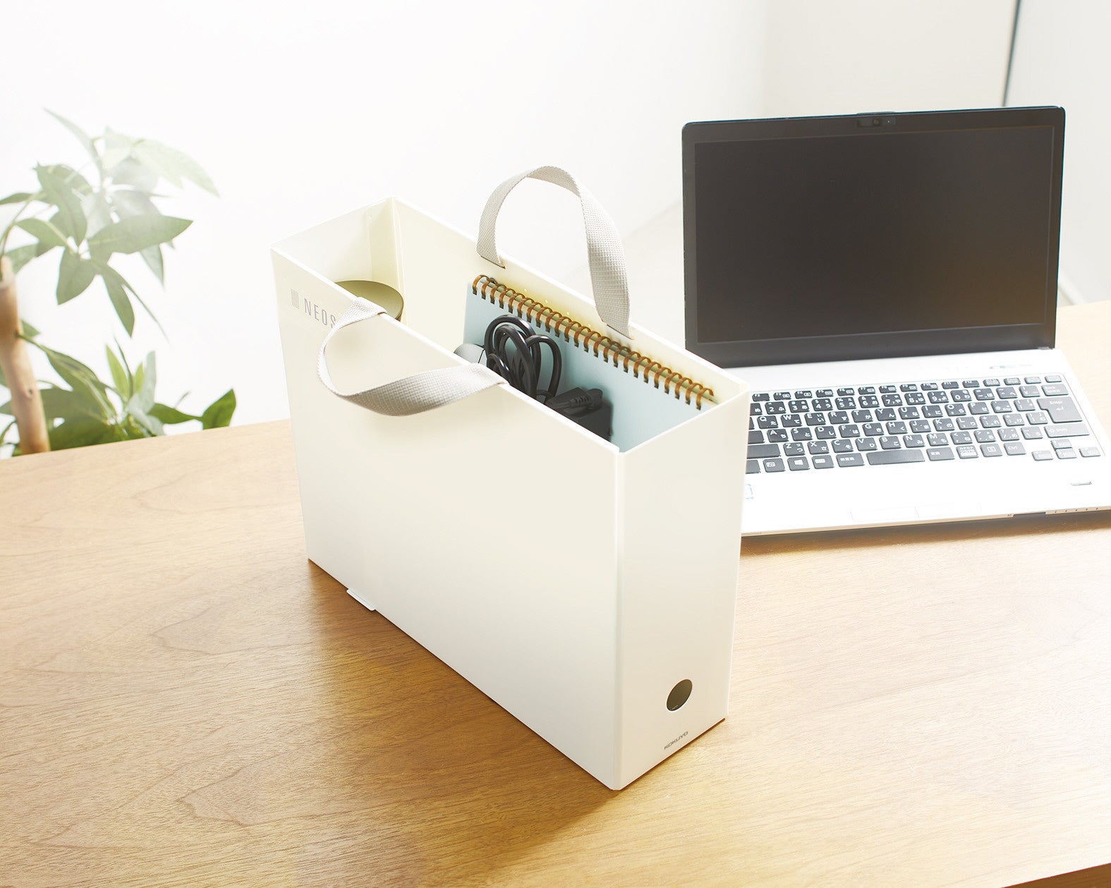 今回発売する「すっきり収納できるキャリーボックス<NEOS>」は、シンプルなファイルボックス形状でありながら、内部にワンタッチで開閉できる仕切りを設けました。これにより、水筒やACアダプター等の小物類もすっきりと整理して収容することが可能です。また取っ手付きなので、家庭内やオフィス内でワークツールをひとまとめに持って移動する際に便利です。