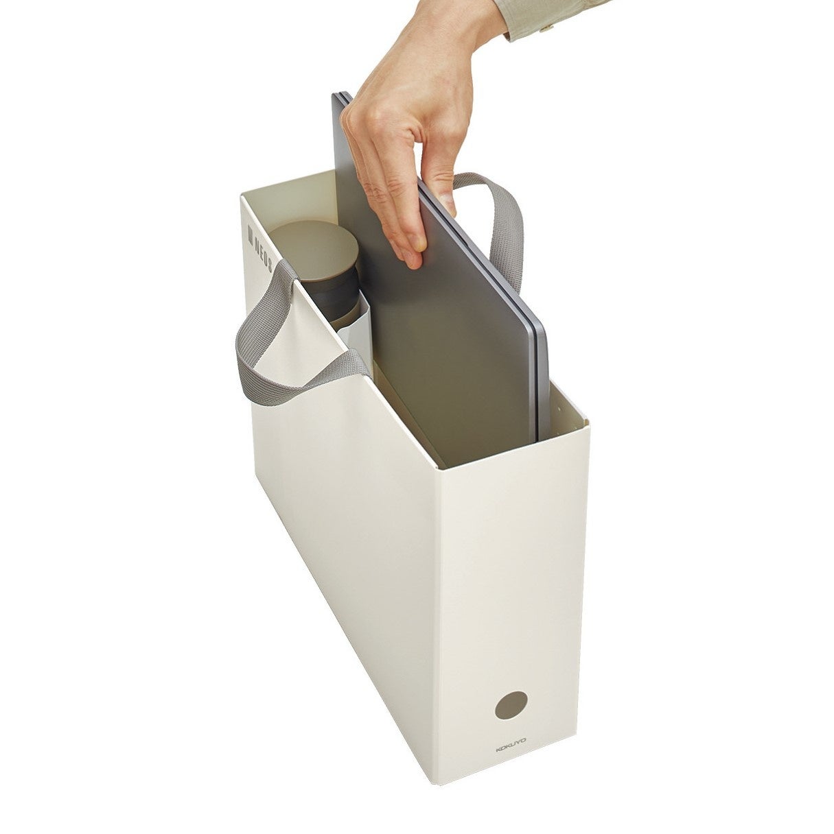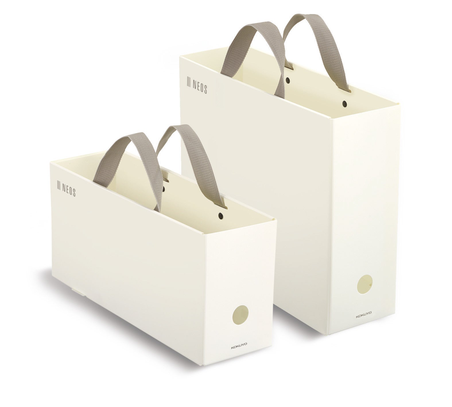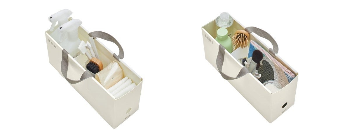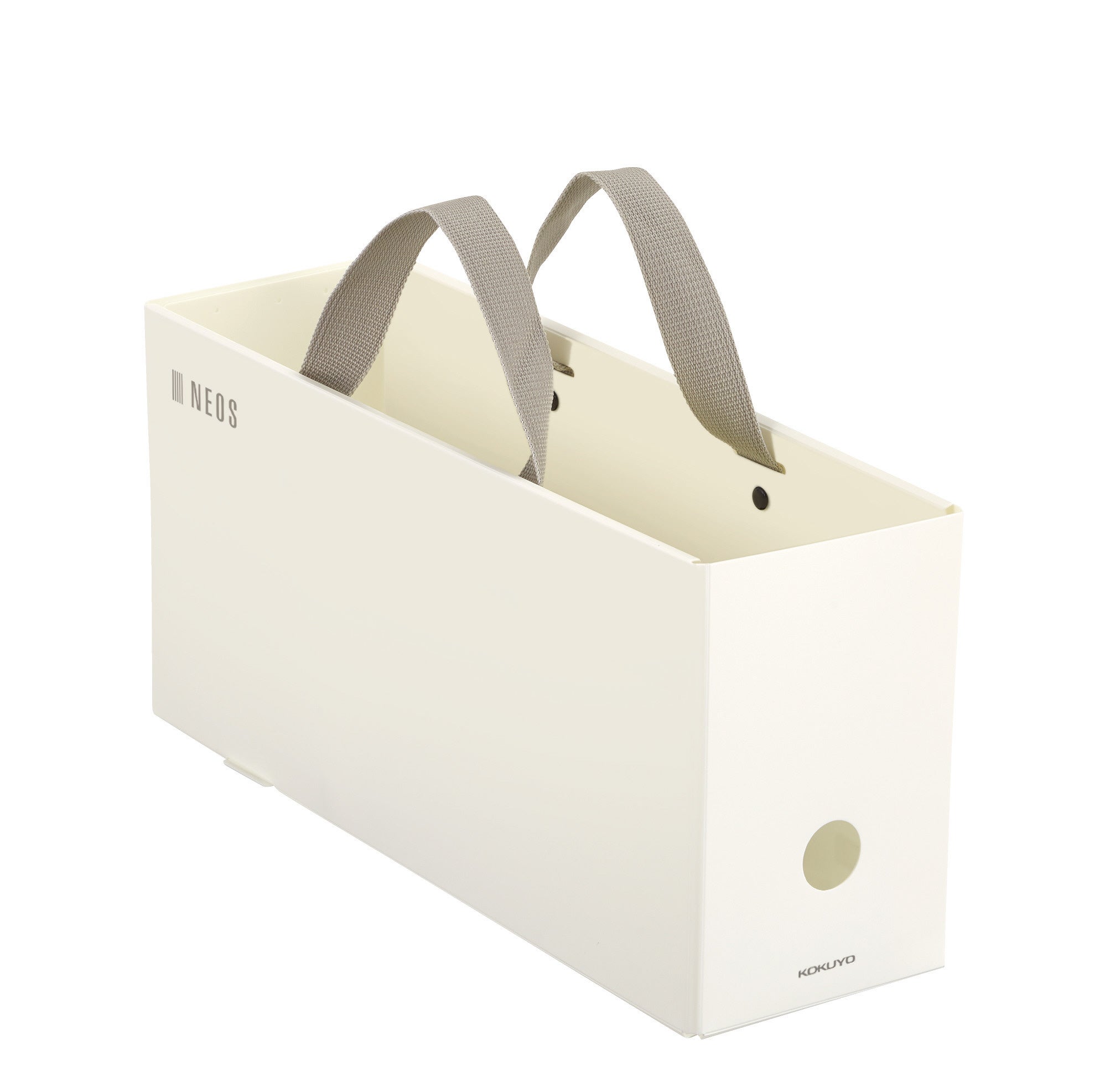 今回発売する「すっきり収納できるキャリーボックス<NEOS>」は、シンプルなファイルボックス形状でありながら、内部にワンタッチで開閉できる仕切りを設けました。これにより、水筒やACアダプター等の小物類もすっきりと整理して収容することが可能です。また取っ手付きなので、家庭内やオフィス内でワークツールをひとまとめに持って移動する際に便利です。