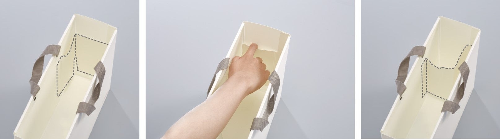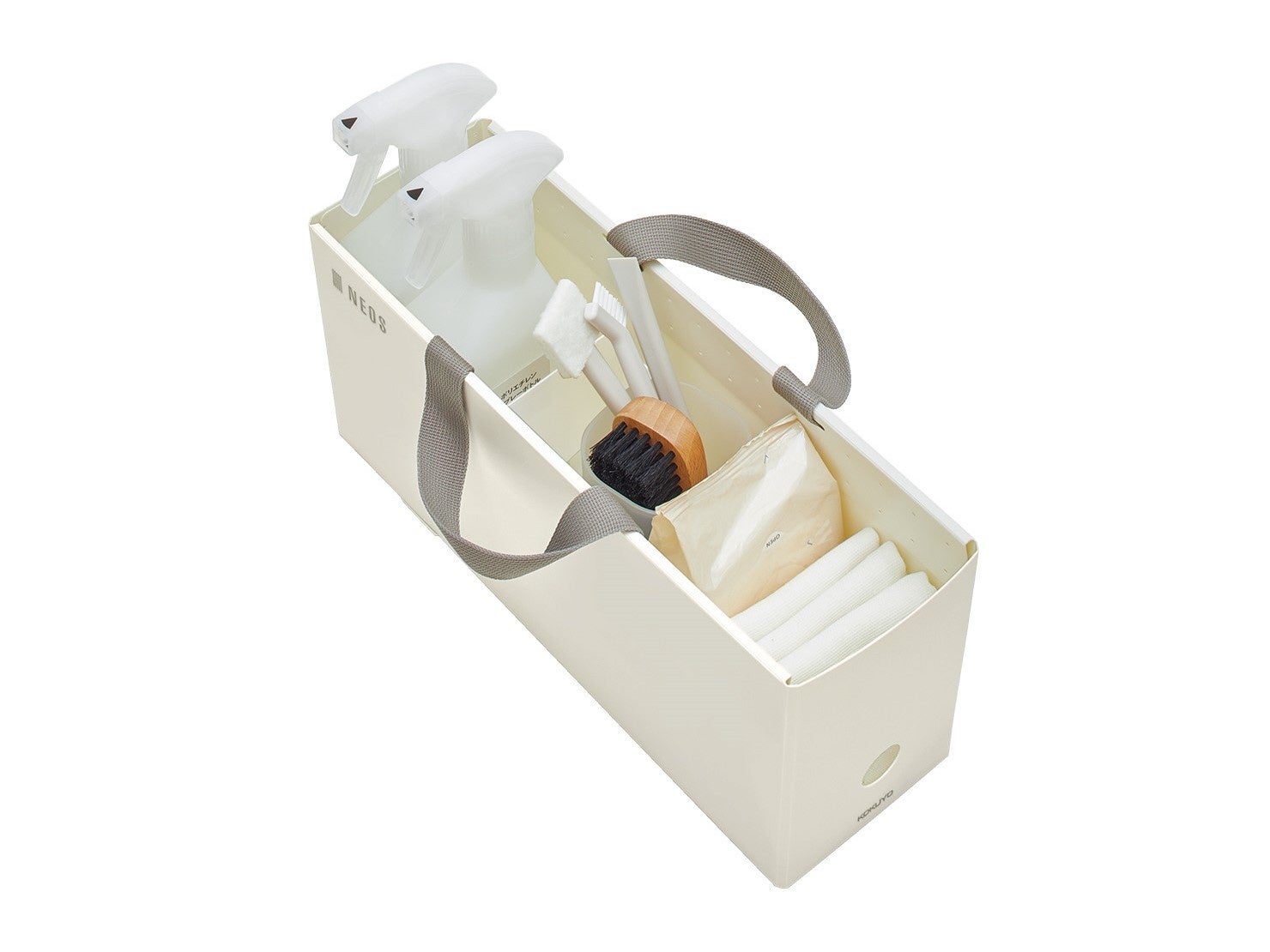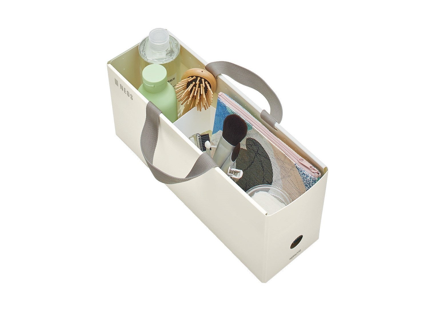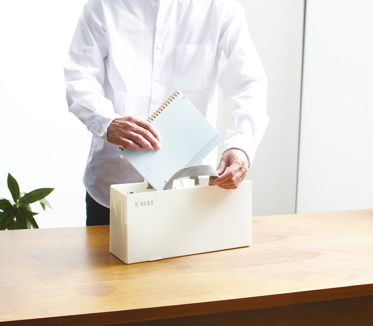 今回発売する「すっきり収納できるキャリーボックス<NEOS>」は、シンプルなファイルボックス形状でありながら、内部にワンタッチで開閉できる仕切りを設けました。これにより、水筒やACアダプター等の小物類もすっきりと整理して収容することが可能です。また取っ手付きなので、家庭内やオフィス内でワークツールをひとまとめに持って移動する際に便利です。