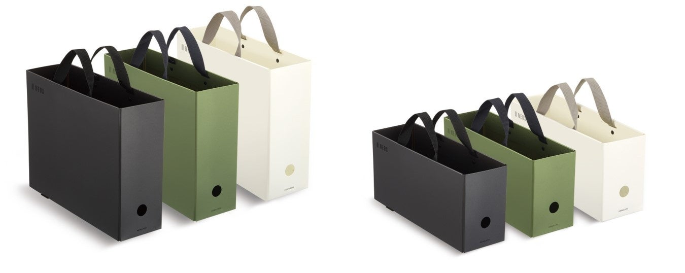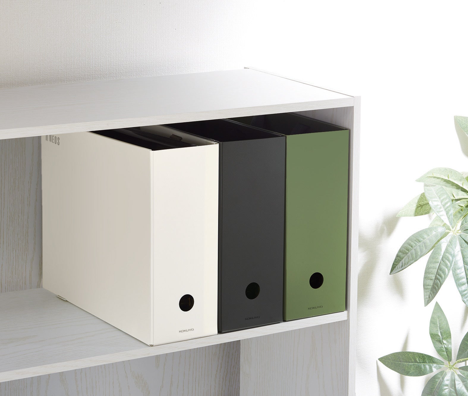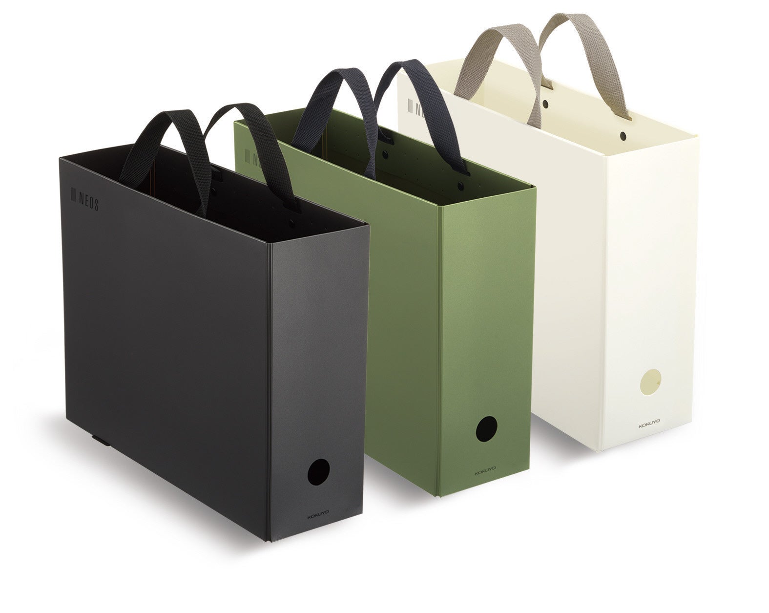 サイズは、13.3インチまでのノートパソコンに対応したA4サイズと、高さが約半分で日用品等の収容にも適したA4ハーフサイズの2種をご用意しました。カラーバリエーションは、オフィスにも家庭にもなじむ、ブラック、オリーブグリーン、オフホワイトの3色です。
