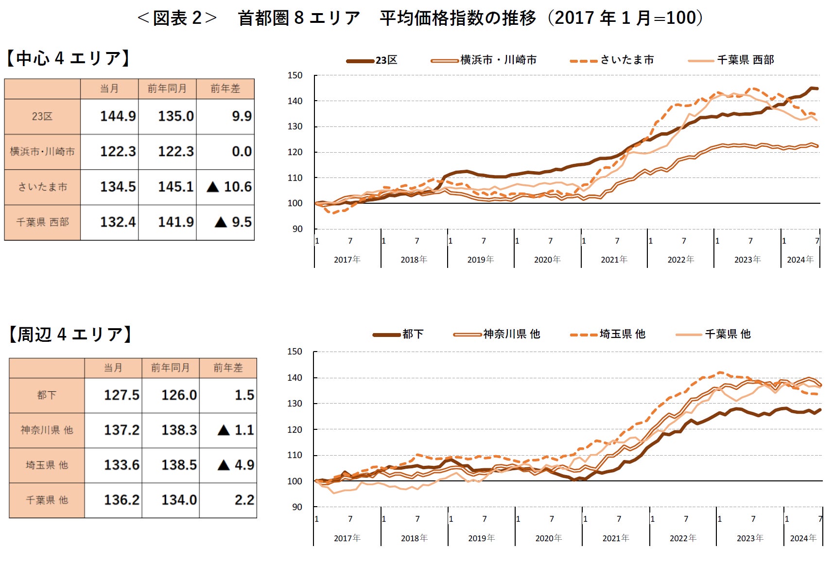 エリア別の前月比は、上昇エリアが東京都下のみとなったほか、神奈川県他と千葉県西部では1%を超える下落幅となっており、全体的に下落が目立つ月となった。中でも、埼玉県他の下落は7カ月連続と最も長くなっている。