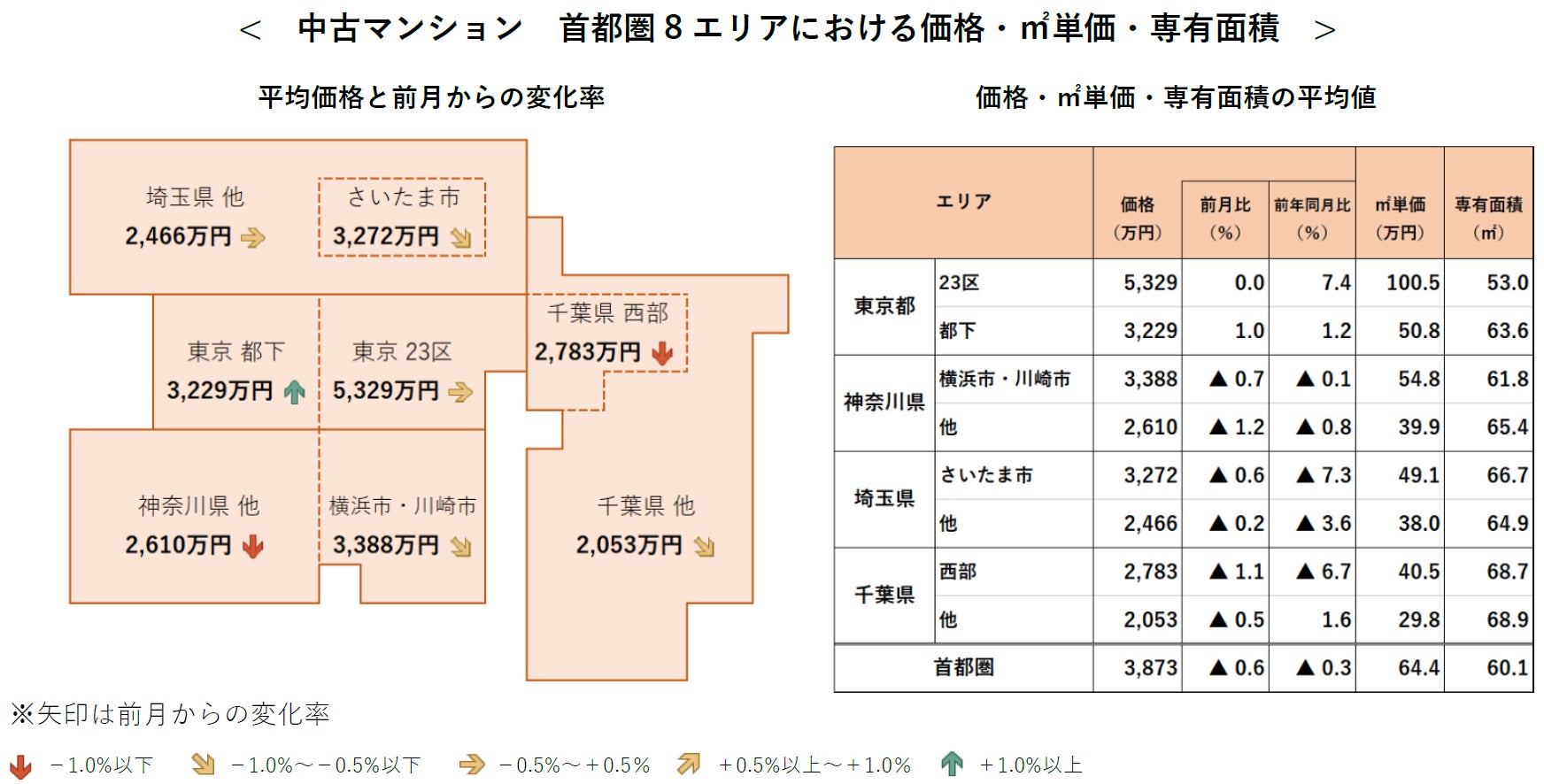 首都圏の1戸あたり平均価格は前月比、前年同月比ともに下落した。
