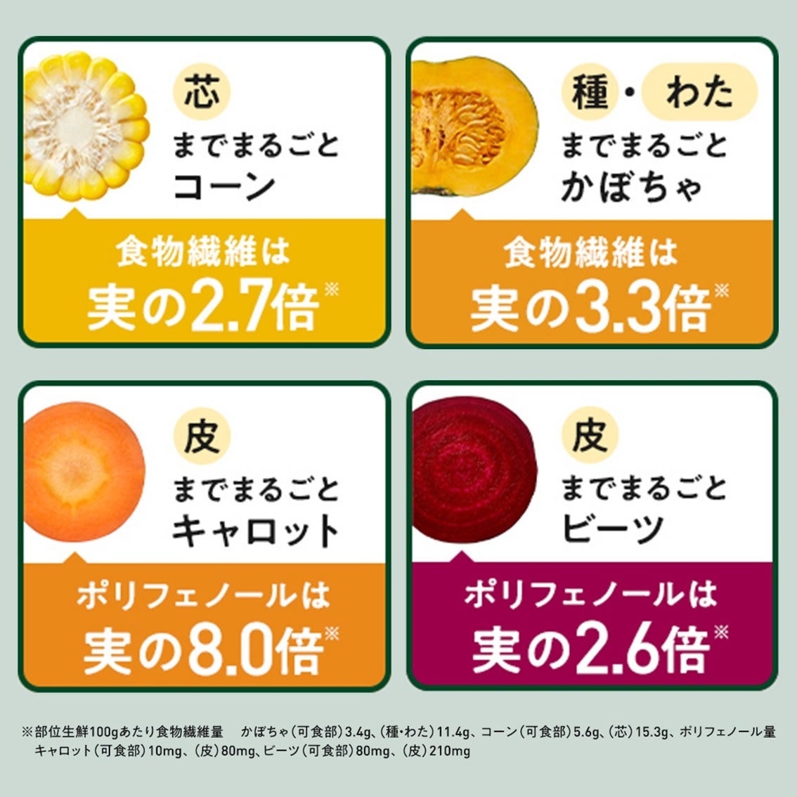 普段食べずに捨てている芯や皮・種・わたまで、可能な限りまるごと使った野菜や、アーモンド、大豆などカラダ想いの素材をギュッと詰め込みました。グルテンフリーで砂糖も不使用、野菜や果汁由来の甘みを活かしました。濃厚で贅沢な味わいは、コーヒーやお茶との相性も良く、ブレイクタイムのお供にぴったりです。