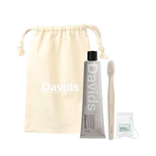 天然原料をベースとしたホワイトニング歯磨き粉と磨きやすさにこだわったサスティナブル素材を使用したバンブー歯ブラシ、リサイクルペットボトルから作られたポリエステル繊維を使ったデンタルフロスのセット。オリジナル巾着付きです。