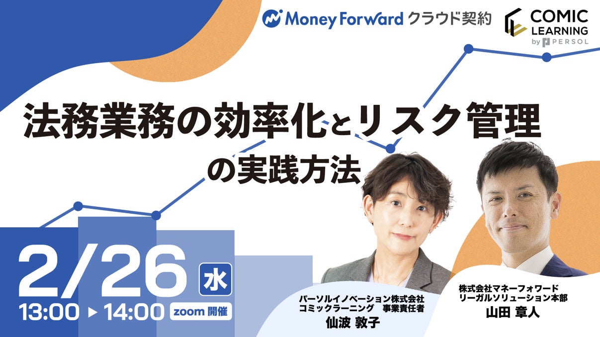 「はたらいて、笑おう。」をビジョンに掲げるパーソルグループのパーソルイノベーション株式会社 Comic Learning Company(本社:東京都港区、Comic Learning Company 代表:仙波 敦子)が展開するコミック教材を活用した研修サービス『コミックラーニング』は、2025年2月26日(水)13:00~14:00に、株式会社マネーフォワード(本社:東京都港区、代表取締役社長 グループCEO:辻 庸介)と「法務業務の効率化とリスク管理の実践方法」と題したオンラインセミナーを開催します。