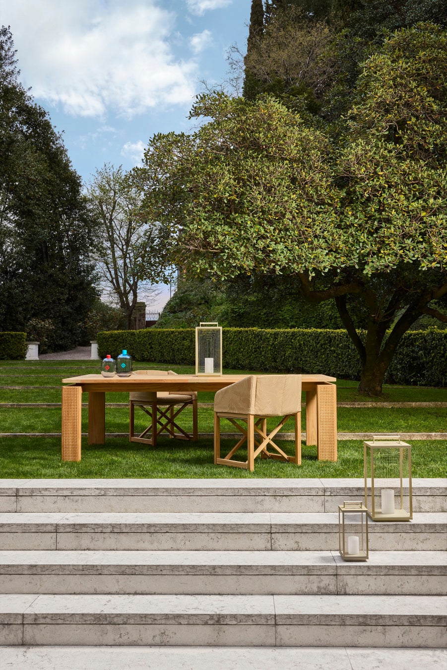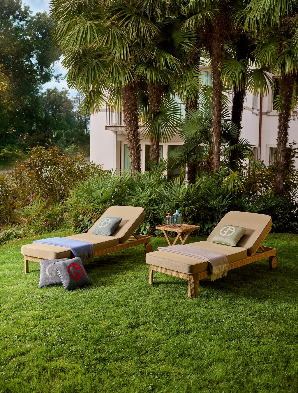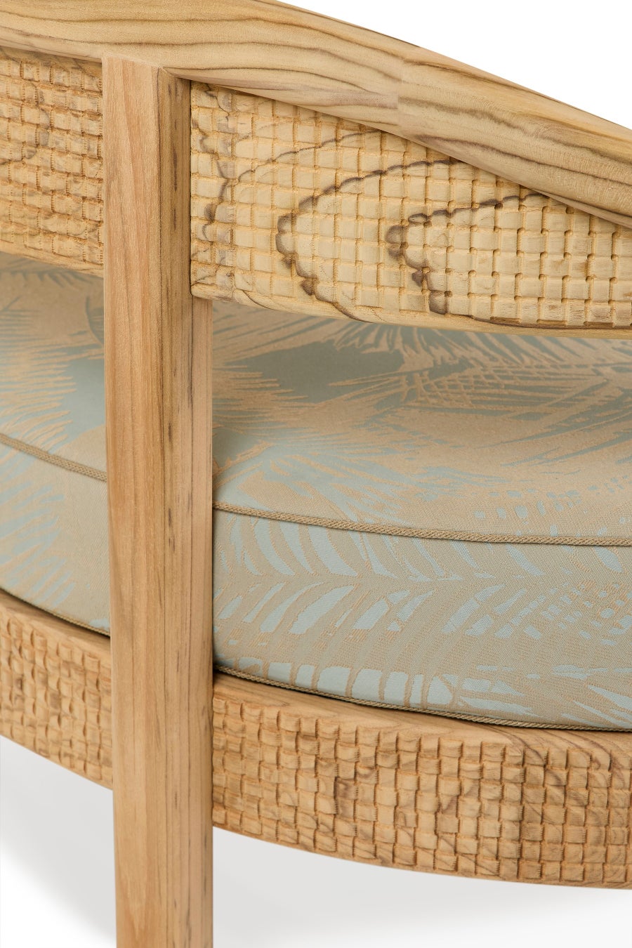丸みを帯びたすっきりとしたラインが、籐の編み目を思わせる独特の彫刻仕上げを施したウィーブドテクスチャーチークと、絶妙のコントラストを演出します。シートとクッションには、屋外使用に耐えるよう撥水加工を施した質感と光沢のあるアルマーニ / カーザ ジャカードが使用され、無地と、ヤシのモチーフがあしらわれた数種類の生地をご用意しています。