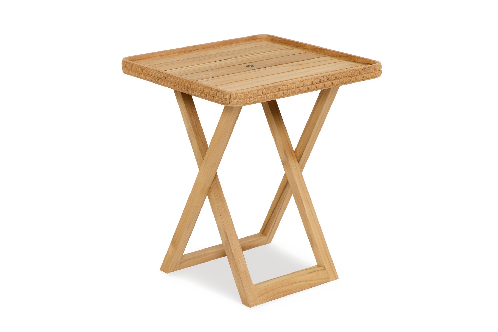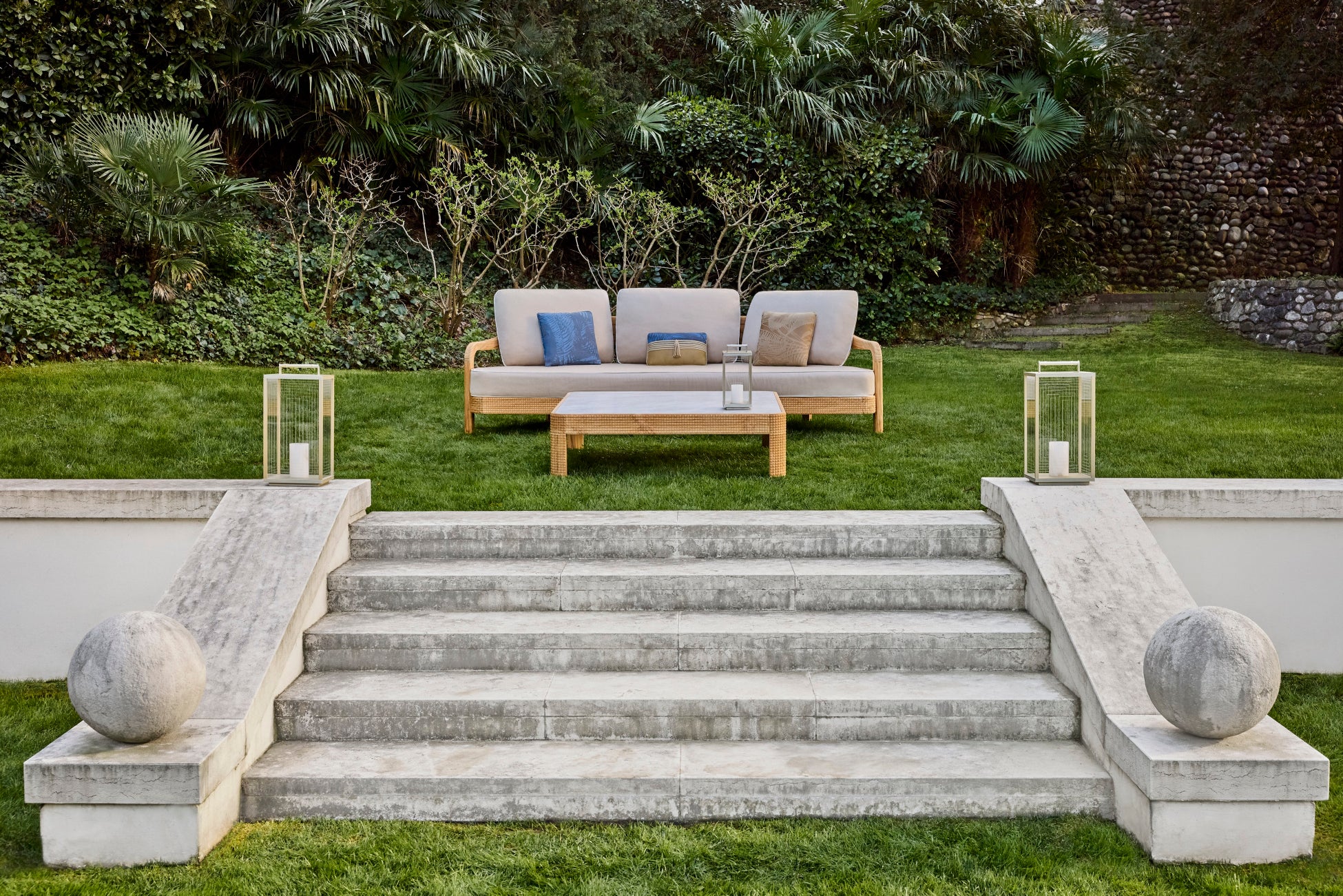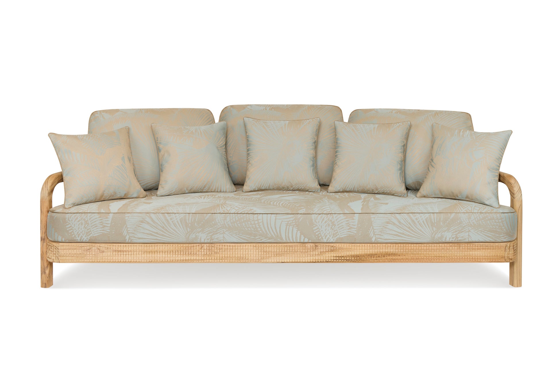 丸みを帯びたすっきりとしたラインが、籐の編み目を思わせる独特の彫刻仕上げを施したウィーブドテクスチャーチークと、絶妙のコントラストを演出します。シートとクッションには、屋外使用に耐えるよう撥水加工を施した質感と光沢のあるアルマーニ / カーザ ジャカードが使用され、無地と、ヤシのモチーフがあしらわれた数種類の生地をご用意しています。