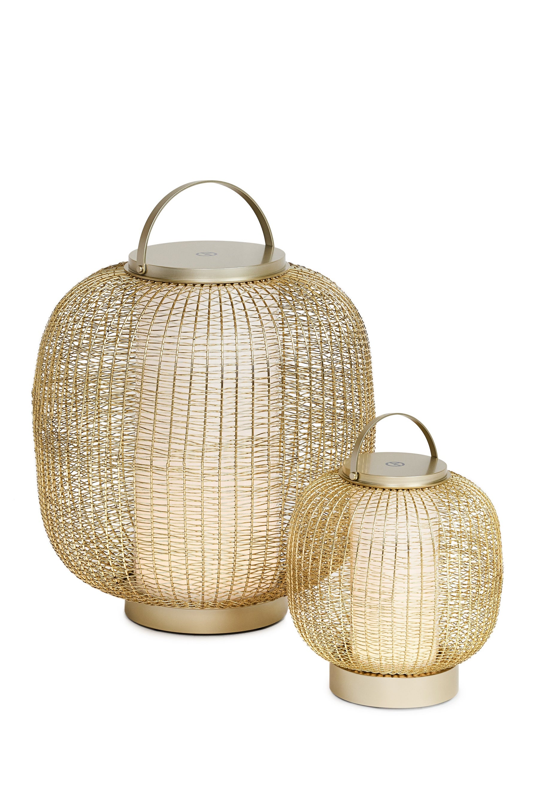 アウトドアランタンの「TRILLY(トリッリ)」は、サテンライトブラスを絡めて作った繊細なシェードがアジアンな雰囲気漂う充電式ランタンで、上部には持ち手がついており、持ち運びしやすい仕様になっています。エレガントな風合いのランタンが、アウトドア家具と共に過ごす優雅な時間を彩ります。