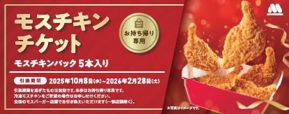 キャンペーンを開始する10月8日(水)から「モスチキンチケット※1」の販売を開始します。「モスチキンチケット」は、「モスチキンパック(5本入り)」と引き換えることができるチケットです。引き換え期間は、2025年10月8日(水)~2026年2月28日(土)と なっており、クリスマスに限らず秋冬にご家族や仲間同士で集まる時にいつでもご利用いただけます。