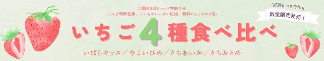 今回で第5弾となったキャンペーンでは、3県のいちご「とちあいか」、「やよいひめ」、「いばらキッス」、「とちあいか」、「とちおとめ」を詰め合わせた「いちご食べ比べセット」を数量限定、お客様送料負担なしにて販売します。各商品3~4種のいちごを詰め合わせており、商品により詰め合わせの種類が異なりますので、お気に入りの組み合わせを見つけることができます。