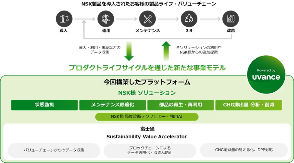 当社は、社会課題を起点とした当社の事業モデル「Uvance」を通じて提供するオファリング「Sustainability Value Accelerator」(注1)を活用し、日本精工株式会社(注2)(以下、NSK)様の軸受(ベアリング)製品のプロダクトライフサイクルを通じてユーザー企業と価値を協創するための事業モデルを支えるプラットフォームを構築しました。本プラットフォームは、部門・工程・企業を横断し、プロダクトライフサイクル全体で軸受のデータを収集・活用し、その状態監視やメンテナンスに関するサービスを提供します。これにより、軸受製品の再生・再利用を促進し、NSK様が企業理念として目指す(注3)地球環境の保全を通じた持続可能な社会の実現に貢献し、企業価値の向上を支援します。